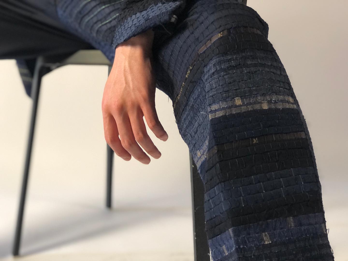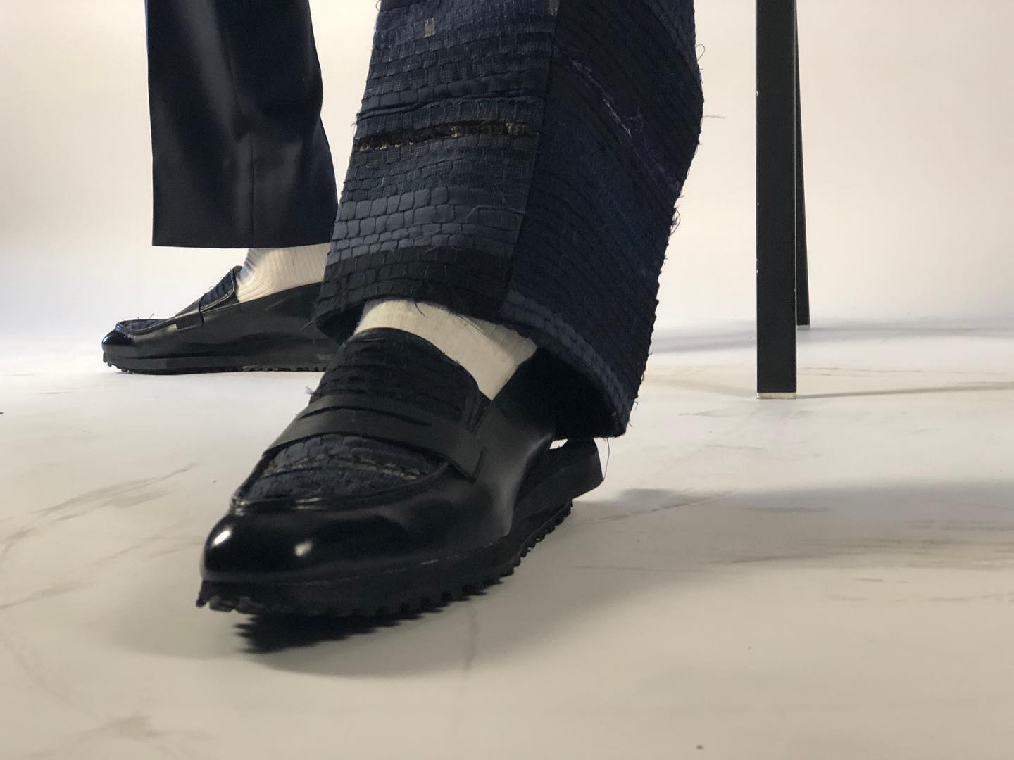「裂き織り」は岩手に伝わる伝統工芸の一つ。傷んだり不要となった布を細く裂いたものを緯糸として織り上げた織物や、それを用いて作った衣類のこと。今回はスーツの工場にちなんで織り直した生地をジャケット、パンツ、シューズ、それぞれのパーツに使用。