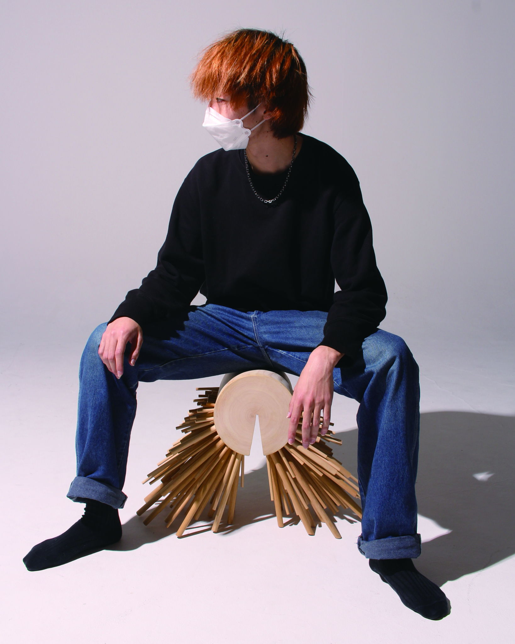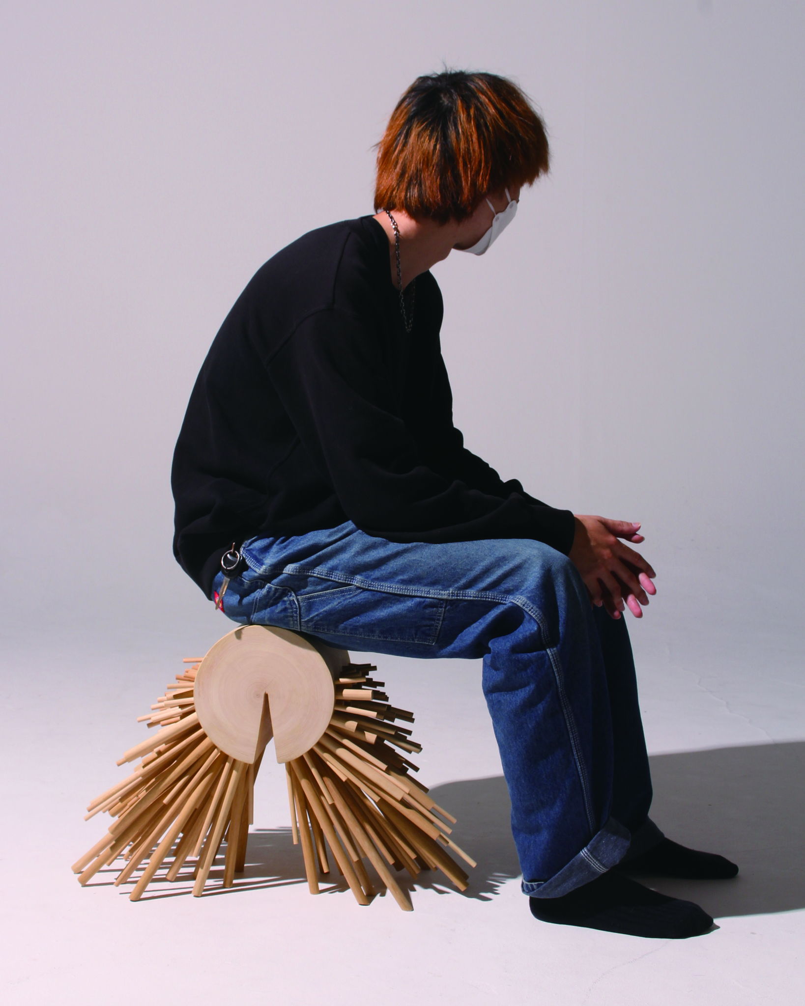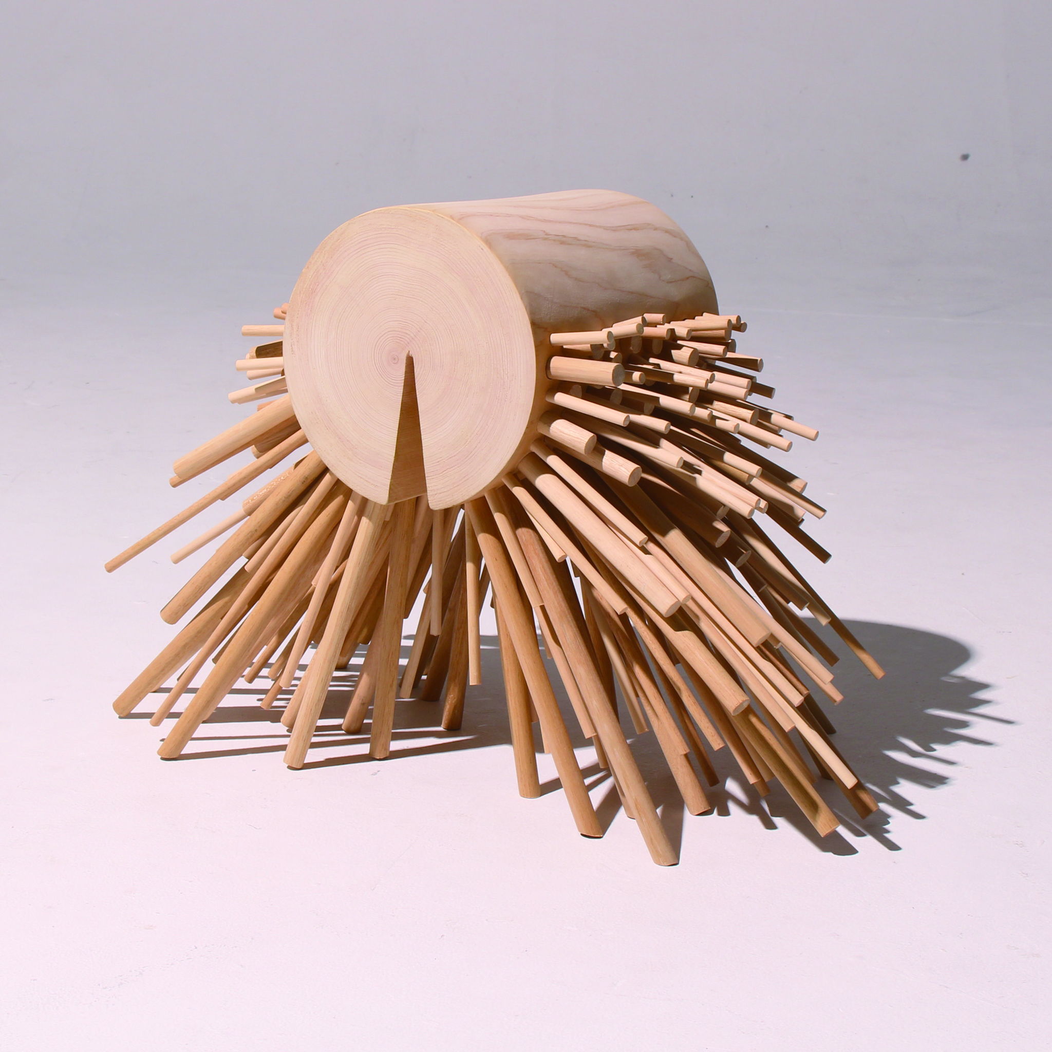 この作品のコンセプトは、「にょきにょき生える」です。四方八方に無数に生えている様は、根っこやうにのように奇妙なフォルムを作り出します。この作品の推しポイントは、丸材の隙間から落ちる光やそこにできる影です。見る角度や光の具合によってさまざまに変わるので、置いておくだけでも存在感があります。椅子でありながら、彫刻作品のようでもあります。