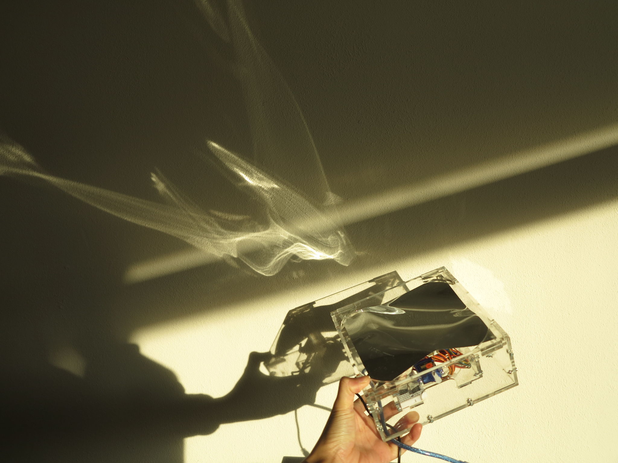 Assembled together, the reflecting object is 17 x 17 x 8 cm³, with a mirror sheet on the top surface. The function of this moving mirror is to reflect light that falls onto it and to reflect the result on a wall - based on the sun direction, and random control. -