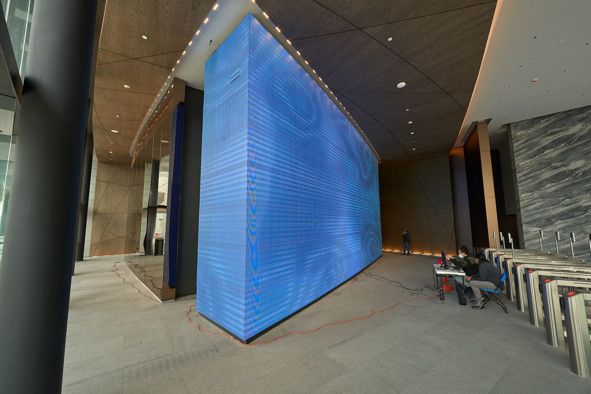 Loom/Weave is a generative artwork by Juan Pablo de la Vega for The Summit in Santa Fe, Mexico City. This piece functions as an autonomous system that, through the development of artificial intelligence algorithms, gathers, groups and sorts in real time meteorological data as well as physical and mobility information from which unique digital fabrics are created. Multiple variables such as temperature, windspeed, cloud coverage, humidity, ECOBICIS mobility, earthquakes and green areas amongst several others are transformed in a framework that generates digital drafts that are being woven in real time in a 12x6 meter screen. Month after month, day after day, hour after hour, minute after minute, the work modifies forms, movements and colour reacting to the city's conditions. Furthermore, Loom/Weave interacts subtly with the building and its users by incorporating aspects like luminosity, noise and even the architecture itself to the drafts.
