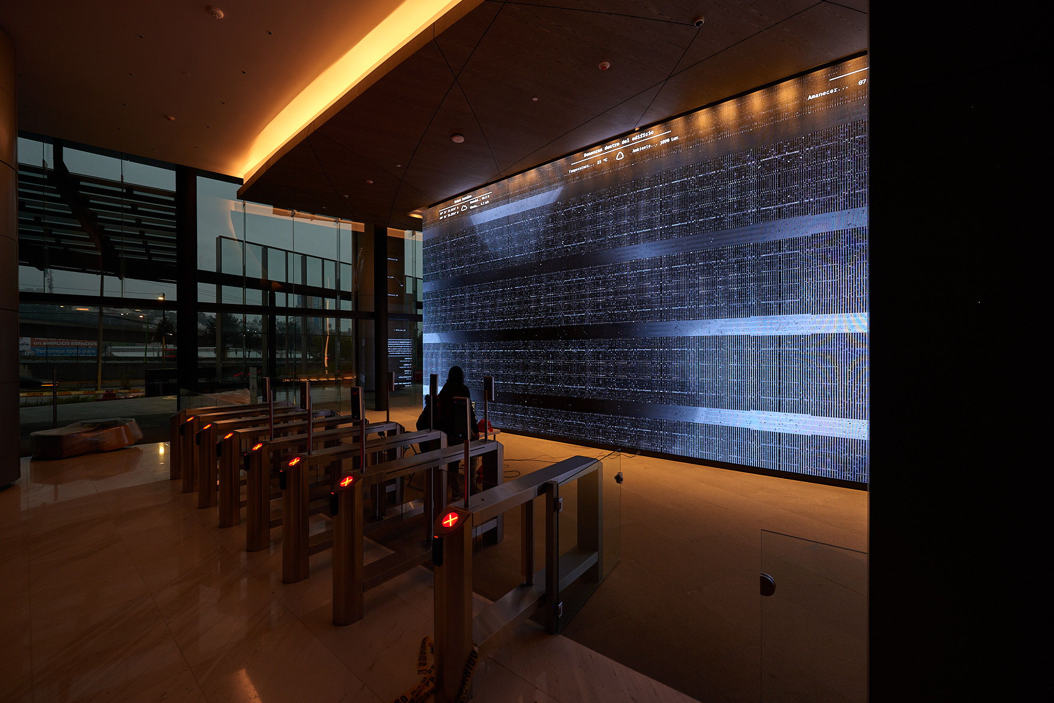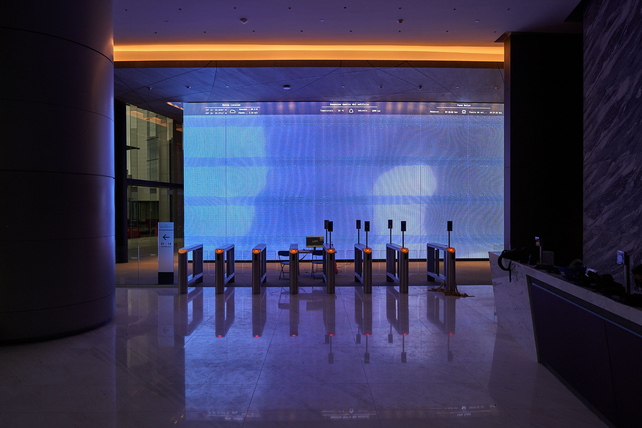 Generative digital artowrk on a 12 by 6 meter screen. Data is gathered from Sentinel 1 and Sentinel 2 satellites as well as open APIs from Mexico City's government. Additionally, sensors have been place inside the building which measure light, sound and movment.