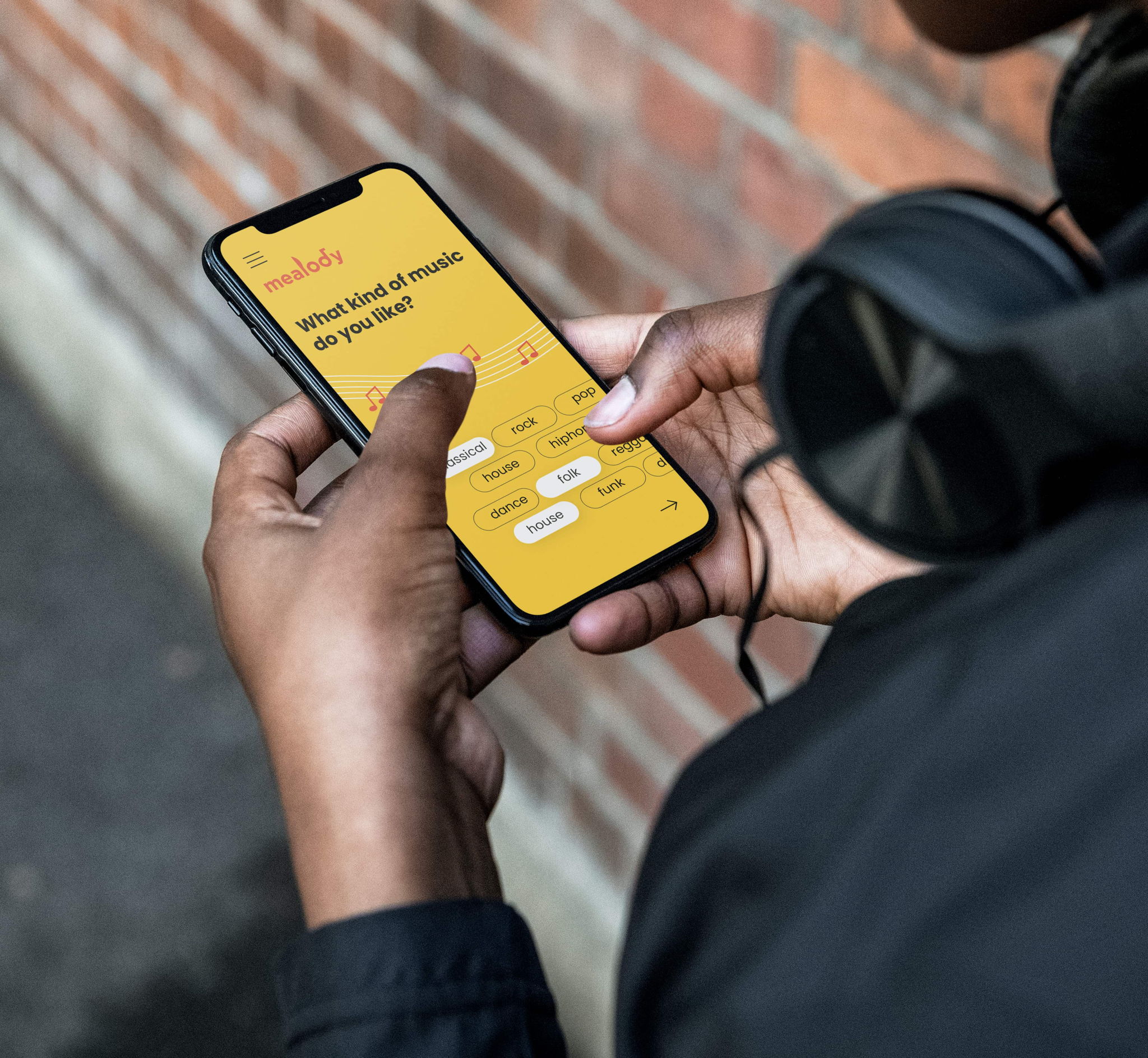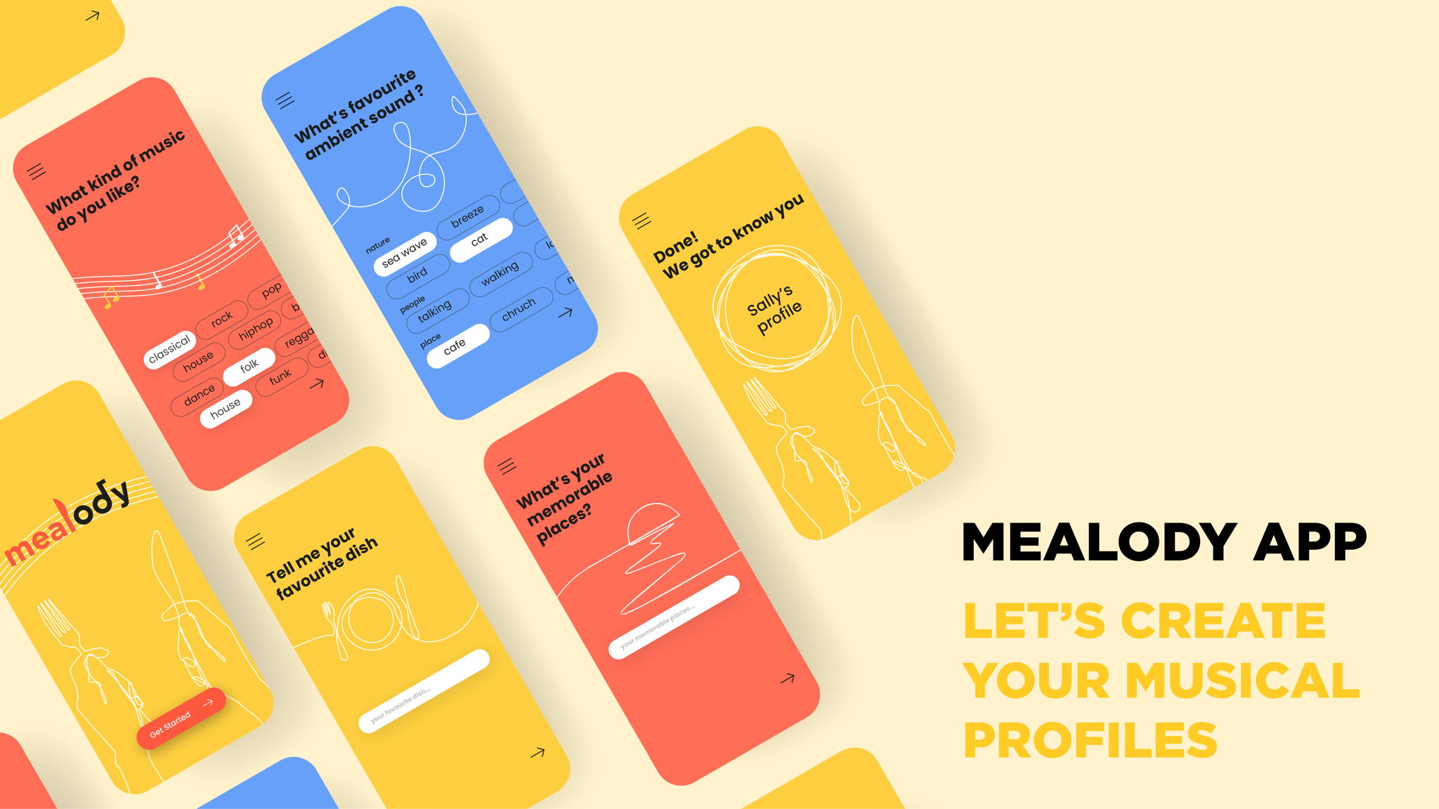 The user journey starts with an app to get to know users’ musical preference by creating individuals’ musical profiles. The main part of this app is an onboarding with a series of questions about individuals’ music taste and memories such as favourite genres, ambiences, memorable places, meals or even seasons. Moreover, this app can encourage you to eat healthier by suggesting certain kinds of music and healthy menus.