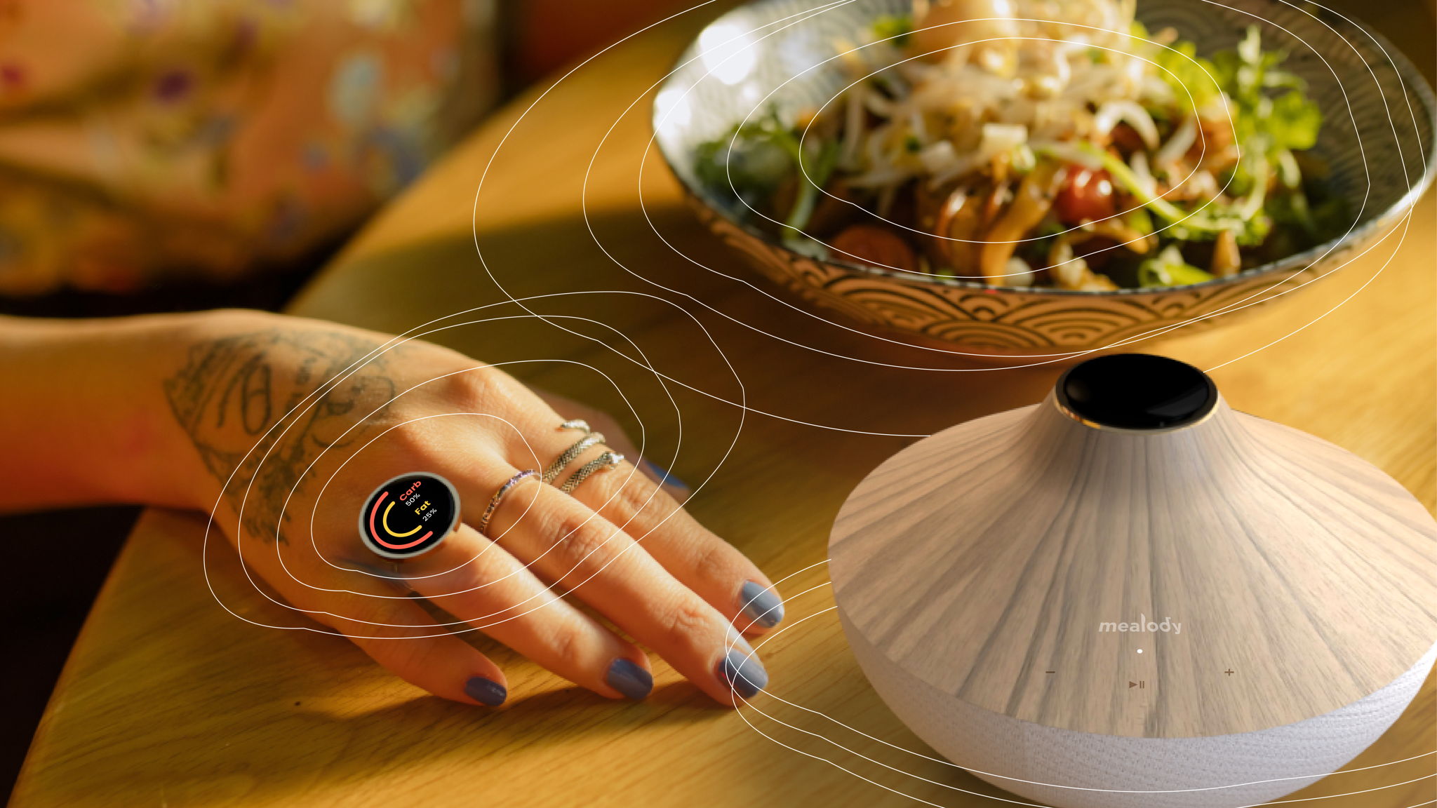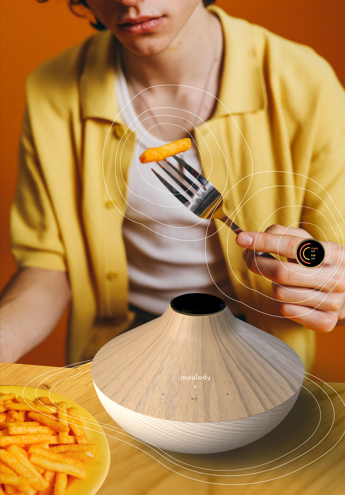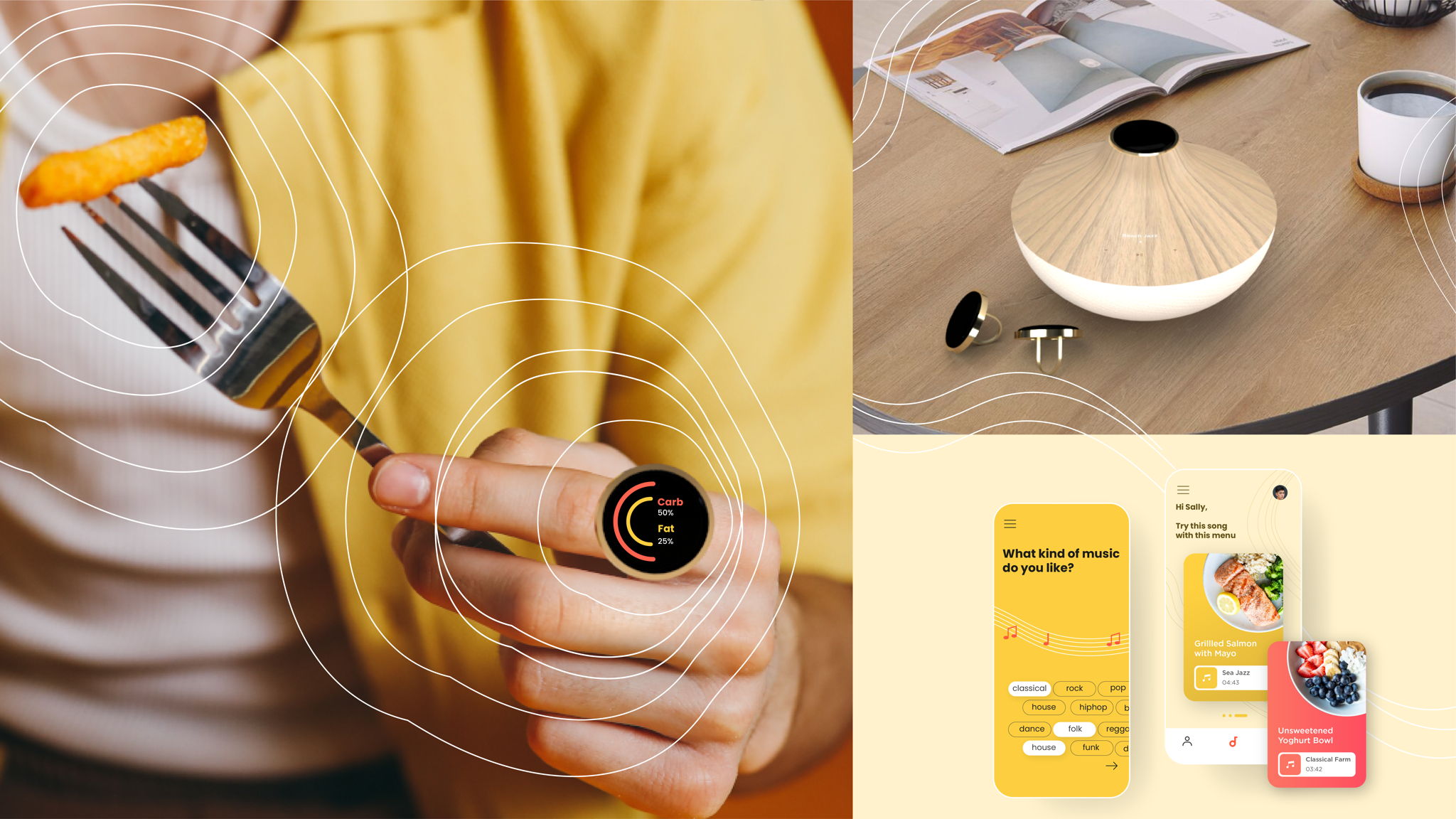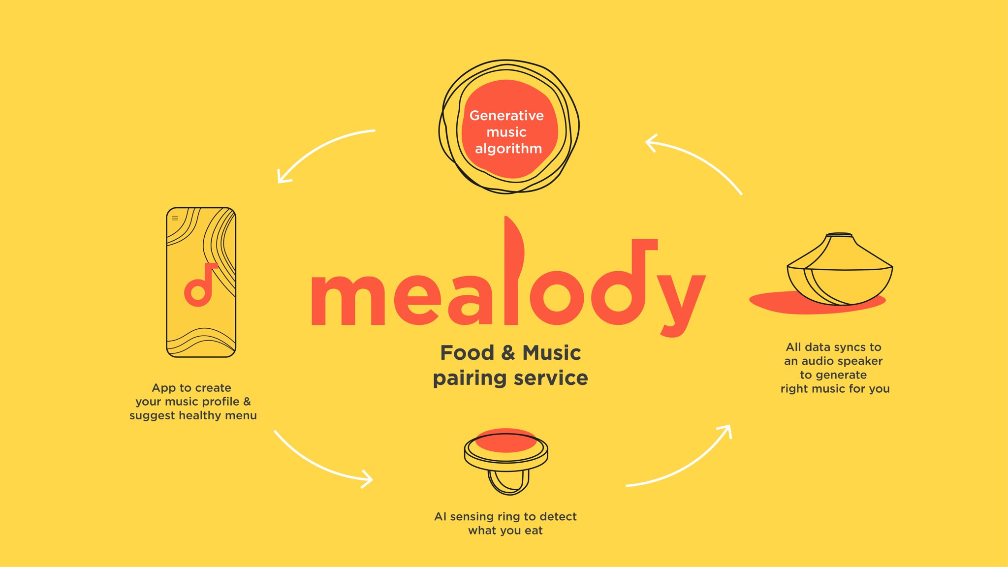 Mealody proposes a four-part component design solution which is a generative music algorithm, an app to set up your musical preference, a sensing ring and smart speaker device.