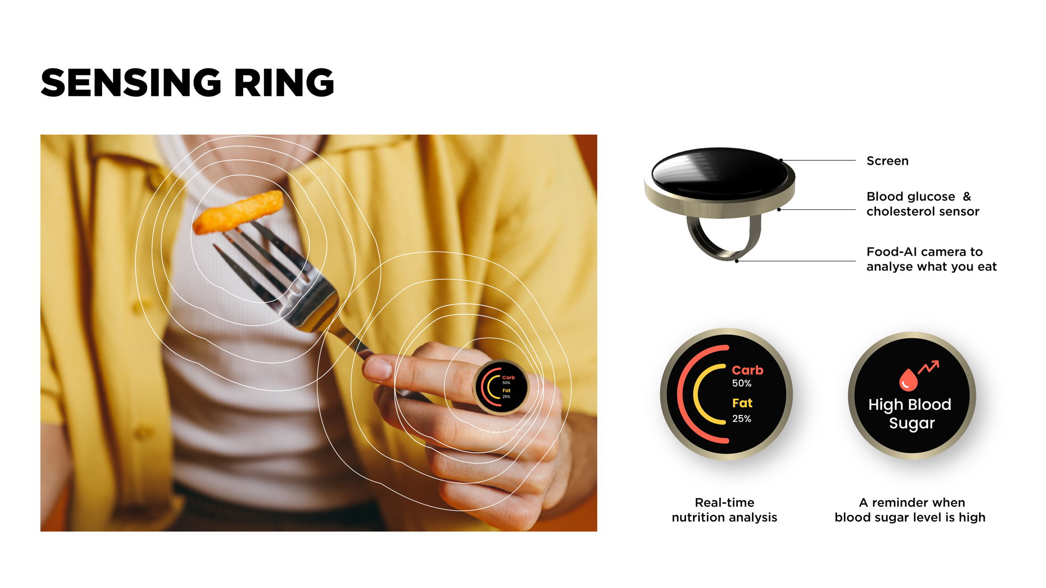 Mealody presents a sensing ring which works as an IOT connector between the music algorithm, musical profile and what people eat.The element of a ring is combined with an AI recognition camera to analyse food that they eat in real time and health sensors. By using an AI recognition camera, the ring can detect and display nutrition facts for each component of a meal such as level of fat, sugar or carbohydrate in real time, helping people make better eating decisions. The food data will be synced into an audio speaker in order to match the right music from users’ preference and food they have. This ring also consists of a real-time blood glucose level sensor by using Radio frequency (RF)/microwave sensing techniques and a Near Infrared sensor (NIR) that can be used to detect cholesterol level. This helps users better track and manage their diets while eating and after meals. The feedback will be displayed on the screen at the top of the ring. This ring is created as a piece of jewellery which is made of brass as a body of the ring and the screen is made of LED screen to display the feedback.