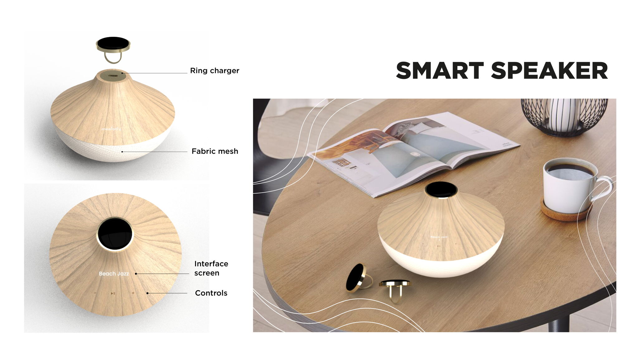 After the system is provided with completed data from the ring and musical profile, the algorithm in the speaker will immediately compose the soundtrack and play the music afterwards. The speaker is made of a plastic covering white fabric mesh and a birch wood as a material for the interface which is perfect to put on your dining table. The wooden interface is on the top of the speaker, uniquely, users can adjust the bandwidth of music tempo by themselves in case they want a more uplifting beat from the given soothing soundtrack. For instance, the speaker plays chilling jazz, they can adjust the tempo so they get mellow jazz-hip hop. On the top of the speaker as a docking station, there is a wireless charger for the ring that users can take the ring off and keep it back for recharging batteries. -