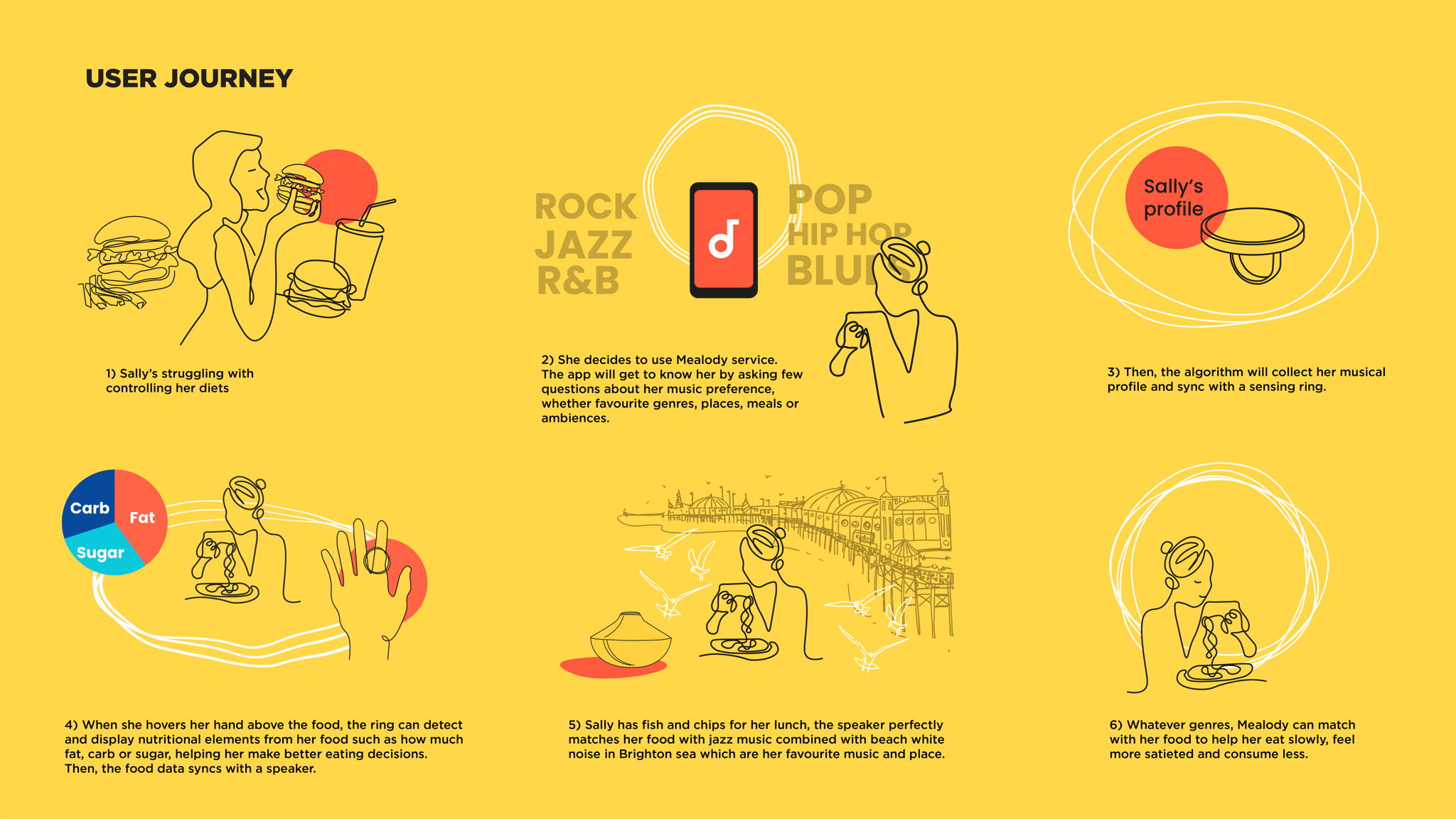From insights to the solution, Mealody presents a connected system through real-time music algorithm with smart devices. In this service, you start by setting up your own music preference on Mealody app then, your profile will be synced with a sensing ring through a music algorithm. When you have your meals, the ring can detect and display nutritional elements from your food, helping you make better eating decisions. Then, it connects with a smart speaker to play soothing music based on your musical preference that perfectly matches with your food. In this relaxing musical vibe, you’ll taste it more, eat more slowly with more satiety and ultimately consume less.