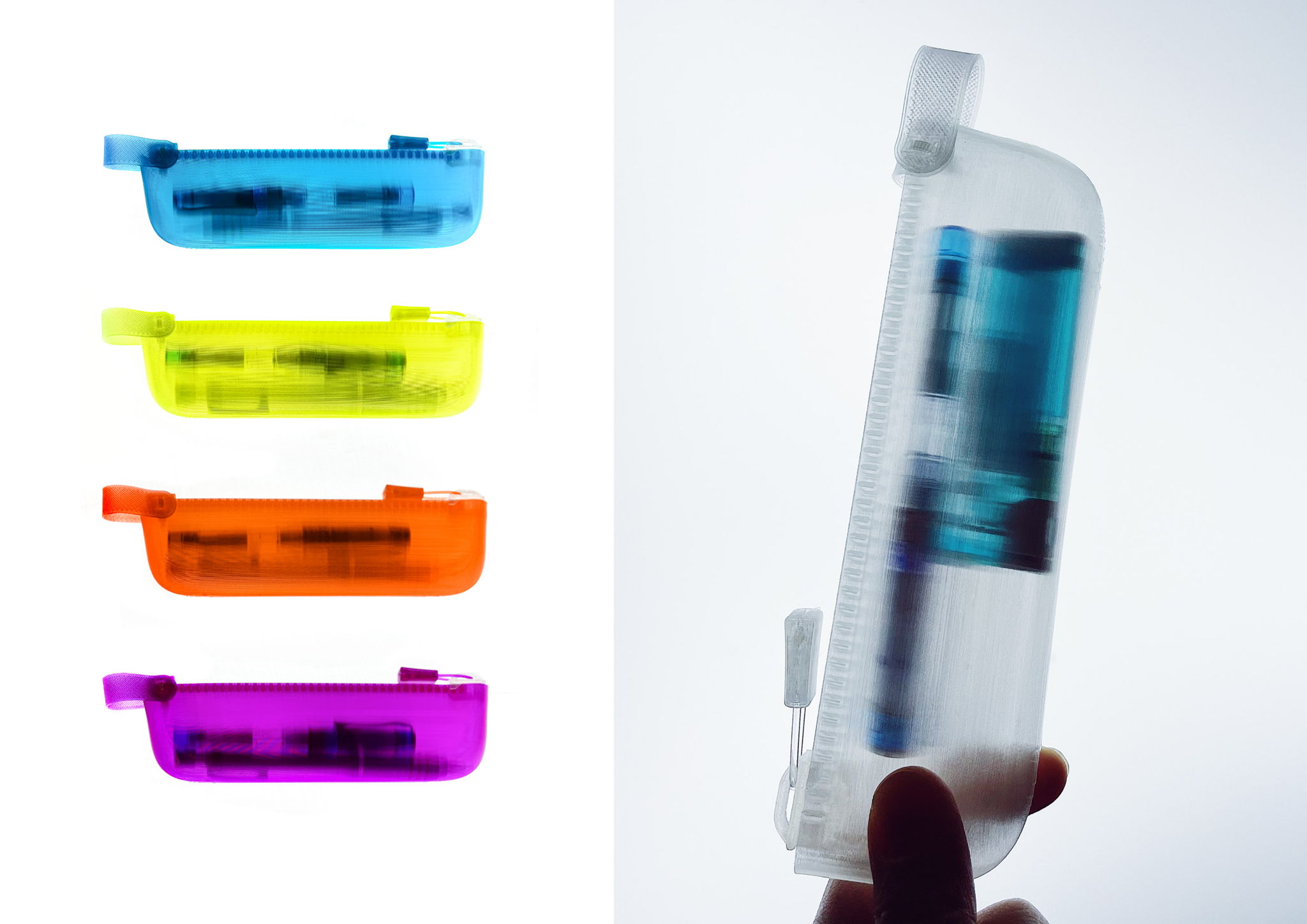 この作品は丹念にTPUフィラメントを積層した際に現れるすりガラス状の質感をそのまま意匠に用いた、ファスナーやスライダーなどほとんど全ての部品を3Dプリンターで制作したペンケースです。この取り組みは現在進行中であり、ペンケース自体は特定の問題を解決するものではありません。この取り組みの最終目的は大量生産品では使えるものがない、あるいは少ない方達のために3Dプリンターで製造しても持ってて嬉しい美しい道具を作るノウハウをまとめることであり、このペンケースはその研究の成果を表現するメディアの一つです。