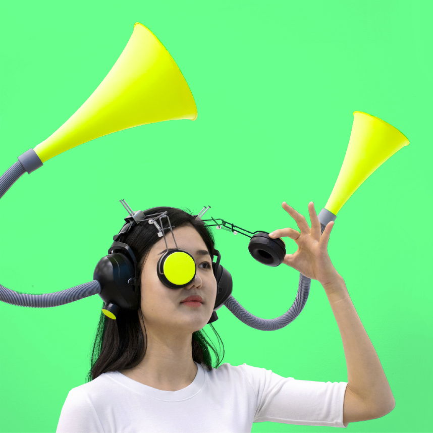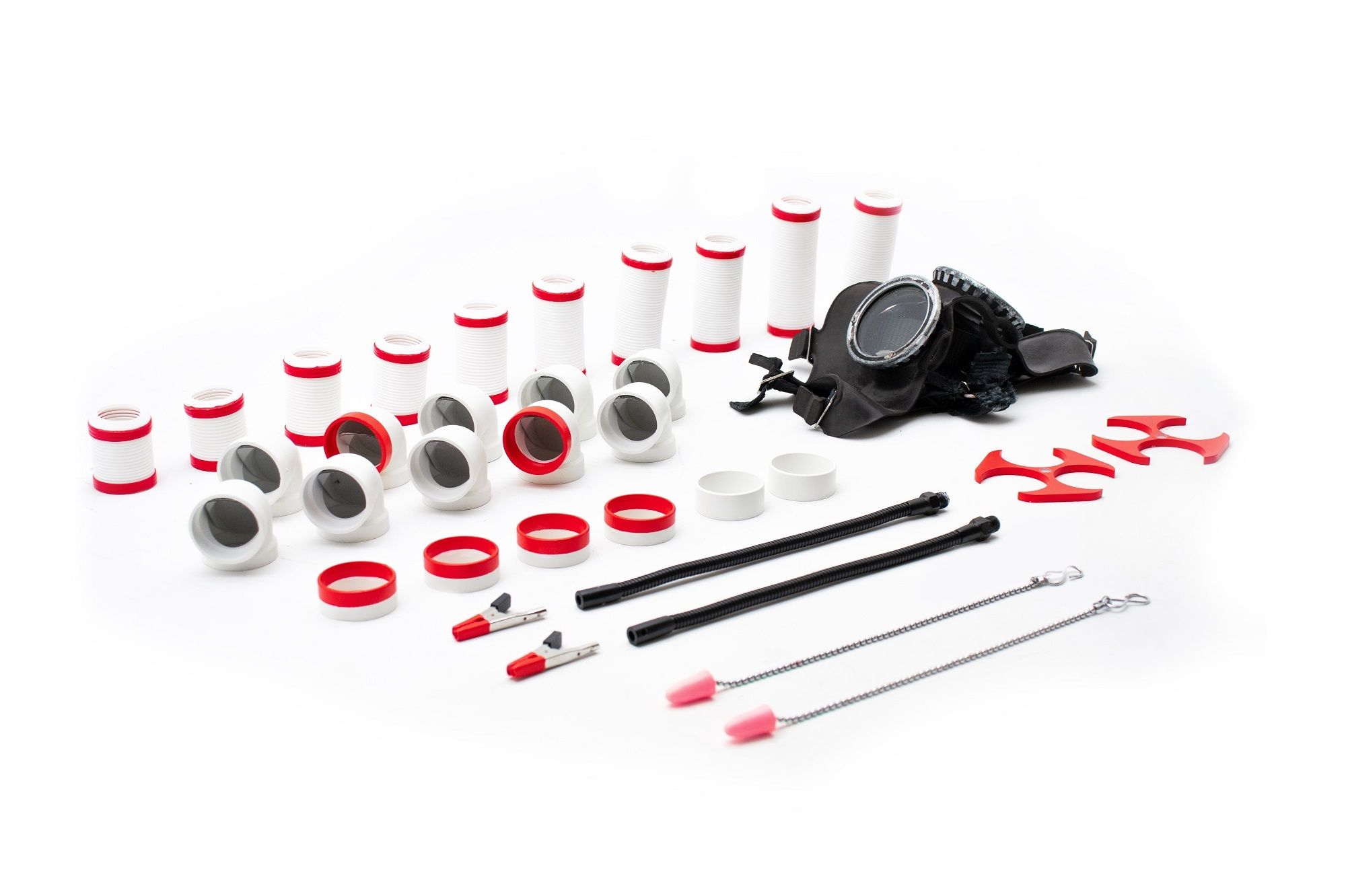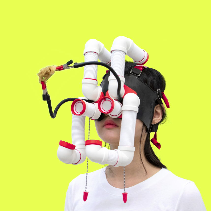 Focusing on sight, this contraption uses mirrors and lenses to observe ordinary matter differently. The lenses zoom on the object held in the clips. One of the periscopes looks at it from underneath, while the other one allows the wearer to see behind them. In order to be immersed in your surroundings and deepen focus, two ear plugs are chained to the mask, blocking out distracting sounds.