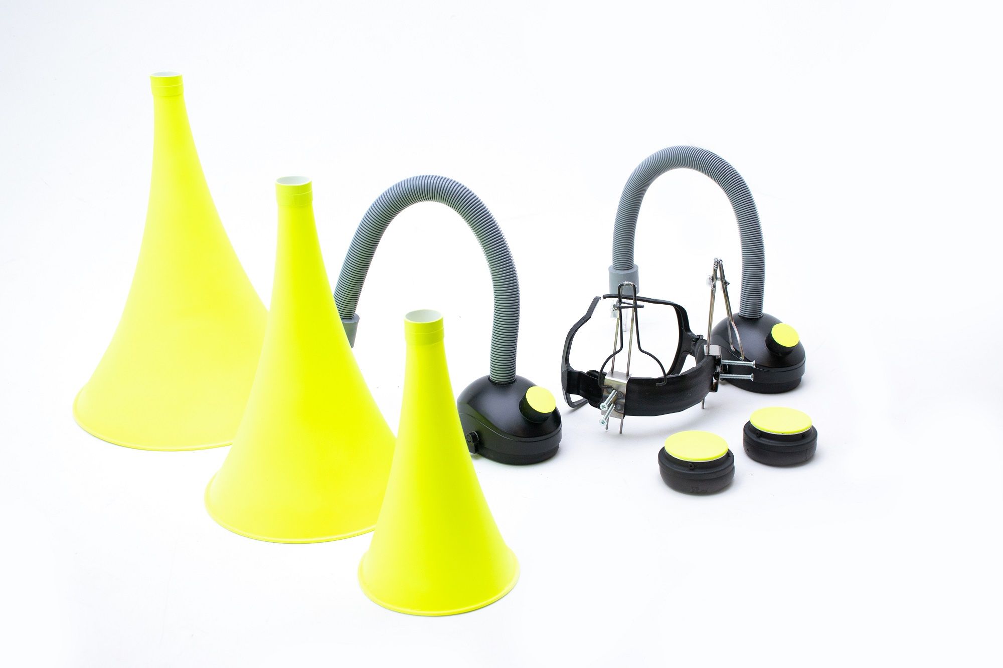 This ear-amplifier device is worn like a headset and is flanked by two flexible hoses, on which different sizes of horns can be plugged in. The sizes influence the frequencies perceived, the capacity of focus and the amplification factor. An eye-covering device is provided to enhance hearing by inhibiting another sense, sight.