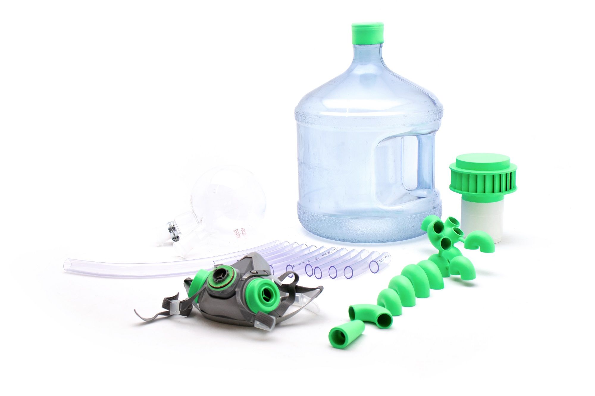 This device enhances our sense of smell. Samples are collected by hand, fed into the funnel, crushed, and finally heated in the glass flask. The scent rises through the complex tubing up to the mask. The other nozzle is connected to a filtered air container, allowing the wearer to clean out their nose with scent-free air.