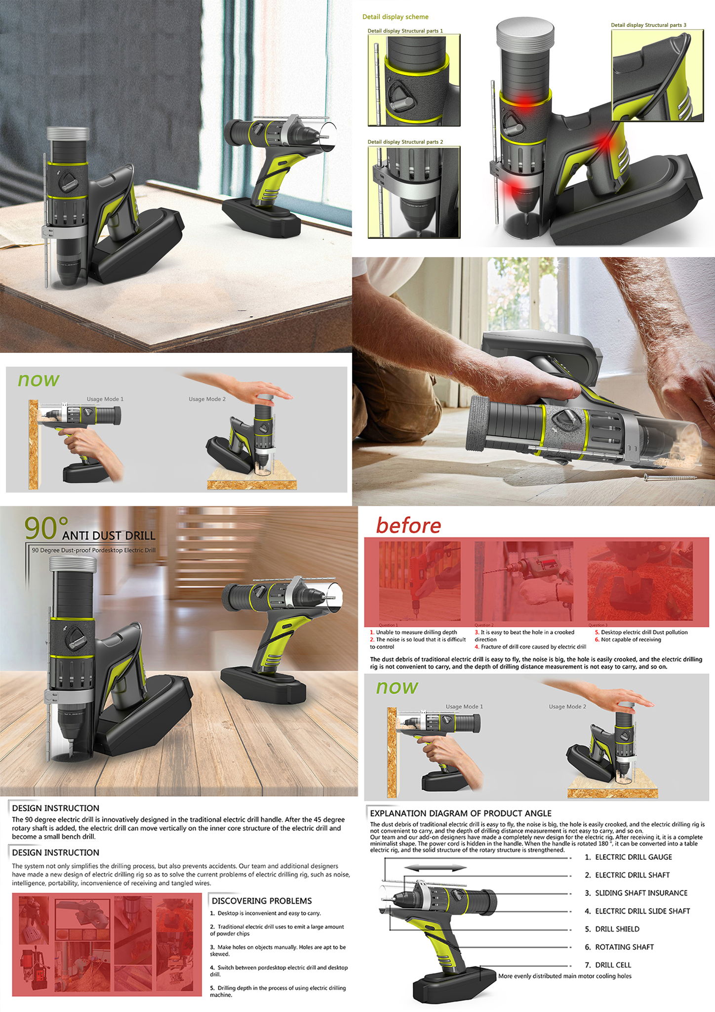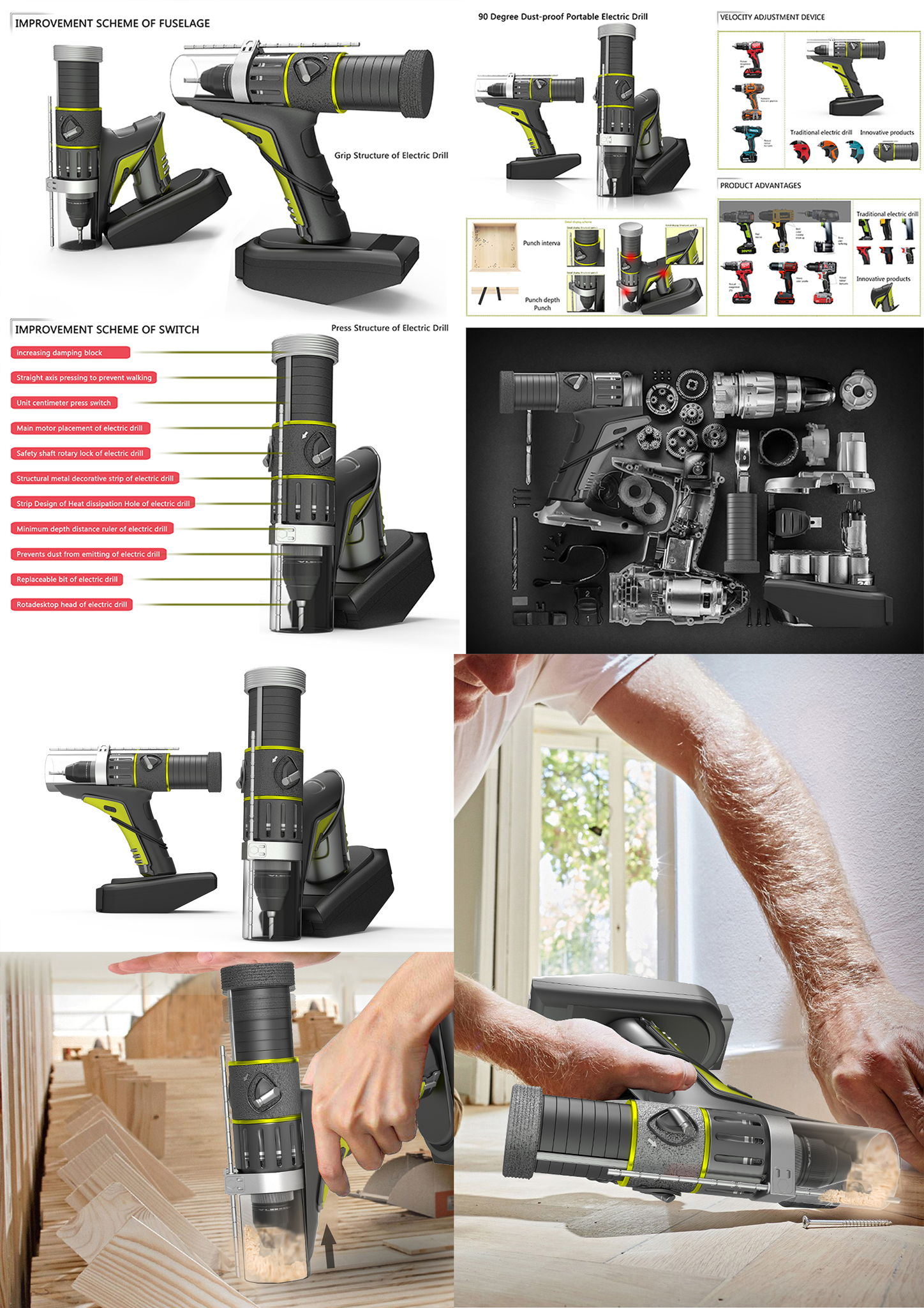 The system not only simplifies the drilling process, but also prevents accidents. Our team and additional designers have made a new design of electric drilling rig so as to solve the current problems of electric drilling rig, such as noise, intelligence, portability, inconvenience of receiving and tangled wires. The dust debris of traditional electric drill is easy to fly and noisy and it is not conducive to the health of the user's lungs. The improved dust debris of electric drill is easy to collect and reduce the noise and is conducive to the health of the user's lungs. There is a transparent protective cover around its bit, which not only stabilizes the fuselage and vertical working plane, but also prevents foam splashing when looking up. -