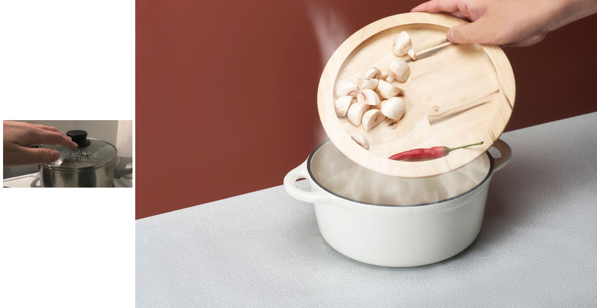 Without sight, locating a hot cooking pot is not so easily done by simply reaching out and touching it. To create a safer system, an alternative pot lid is created from sauna wood. It heats slowly and remains comfortable to touch. The shape is concave and also allows food to be placed onto it. By tilting the lid, the food on top can be effortlessly dropped into the pot beneath.