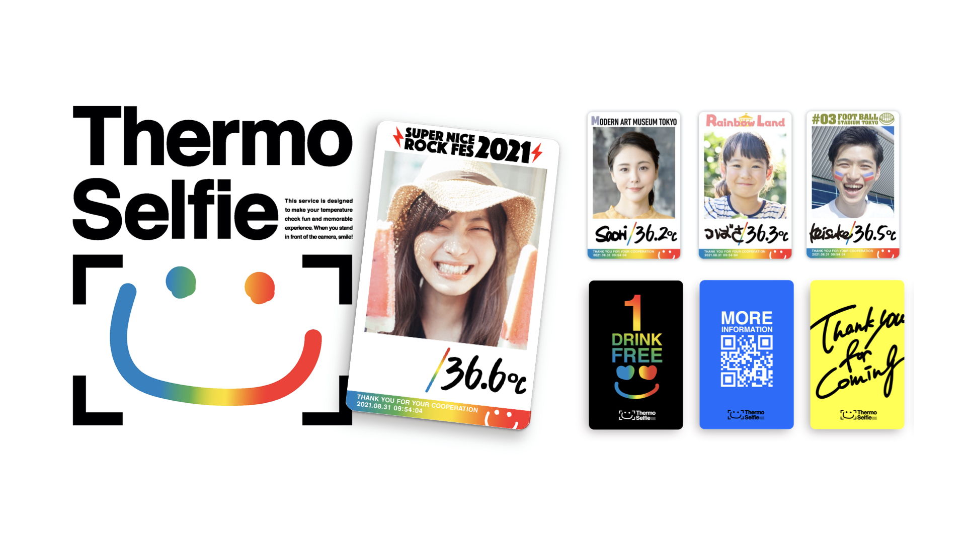 ”Thermo Selfie” は検温と共に撮影を行い、写真をフォトカードとしてその場で印刷する、検温プリント体験である。本プロダクトは、イベントの体験を笑顔で開始してほしいという思いから開発された。正常体温を証明できる顔写真つき入場パスになると同時に、元気にその場をむかえられた思い出となる。カードのデザインは表裏ともにカスタマイズ可能。表面右側には計測された温度が手書き風なフォントでデザインされ出力。表面左側には自身の名前をサインする余白を作ることで、検温証明の意識付けと同時に、イベントとの思い出の品としての感情移入させる機能を持つ。裏面はカードに事前印刷することでランダムにクーポンの発行や、キャストによるサプライズのサインやメッセージを仕込むこともできる。本作品は試験運用が始まり、老若男女が検温機に向かいポーズをとる様子がみられた。ノンバーバルなデザインとシンプルな操作性により、立ち寄った外国の方々も気軽に検温体験を行うことができた。音楽フェス、スポーツリーグ、結婚式など様々なイベントへの導入を目指す。本作品は検温という面倒で事務的な作業を「フォトカード出力」や、「ボックス型撮影機」という極めて日本的に若者に馴染みのある手法を使っている。検温作業をエンターテインメントにするだけでなく、実施しなければいけない感染対策をも演出の一部と捉え直す可能性を世界へ提示する、今後のイベントのニュースタンダードとなる作品である。