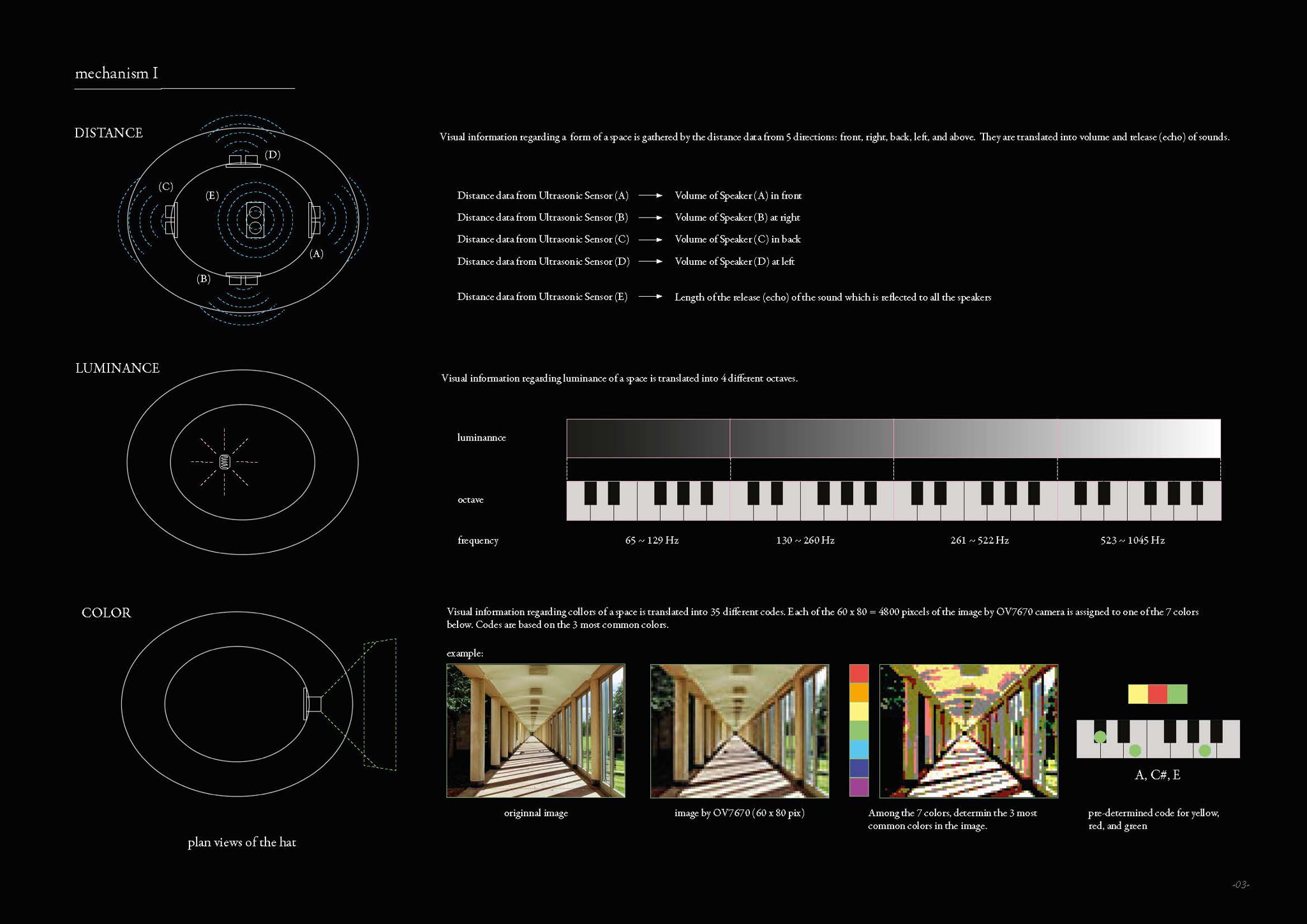 “Hear-chitecture”は、建築を聞くことを可能にする帽子である。5つの方向(前後左右+上)への距離、照度、そして色の三種類の視覚情報が、この帽子により音量とエコー、オクターブ、そしてコードの聴覚情報にそれぞれ翻訳される。
