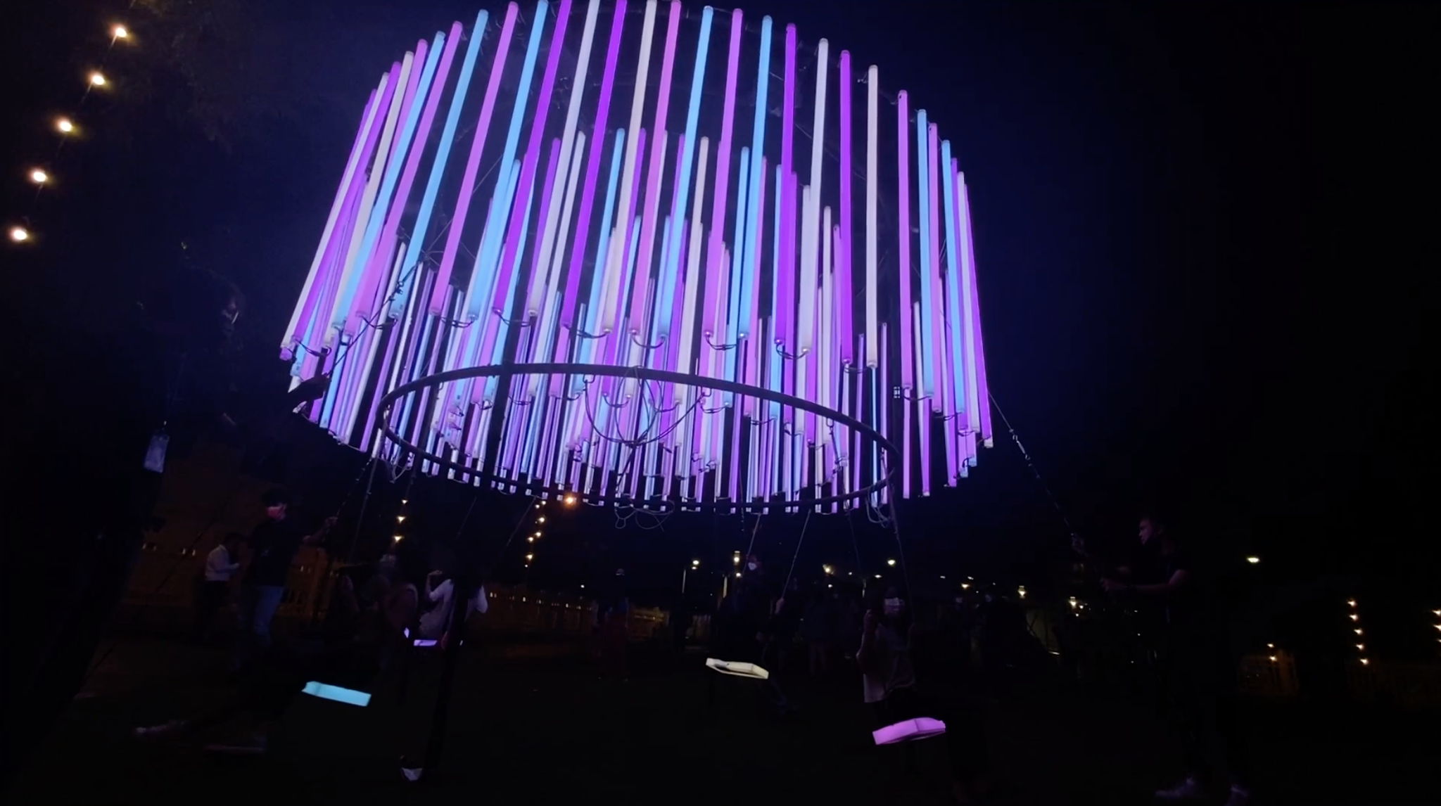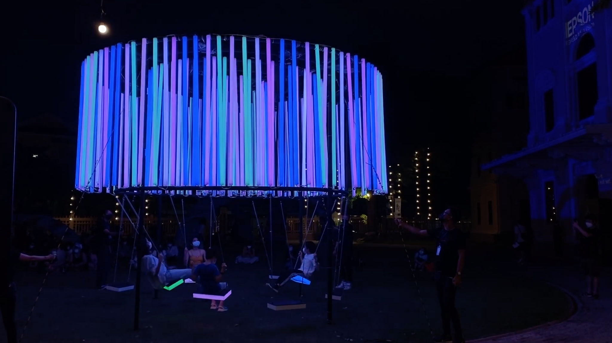 In a democracy, everyone has a responsibility for the decisions made and for the outcomes and results of those decisions that affect everyone in the democracy as a whole. However, in some cases, the results may be skewed by certain stakeholders who are more senior or may have more authority and privileges than others. This may occasionally mean that the results fall in favour of the few, rather than of the many, meaning that, even in a democracy, decisions could be made that aren’t benefitting the whole of the communityInteractive Swing is an experimental expression of democracy, giving people the equal opportunity to control the lights themselves by swinging the swing. The interactive swing features 8 individual swings which each have their own sensors and colours to define and identify them. When someone swings the LED tube located above the swing is triggered and lights up in a rhythm according to the specific movement of the swing. The more people that get involved, the more varied and stimulating the colour scheme becomes. The vivid light patterns only appear when people participate, making it a more interactive experience. When there’s no one using the swing, the lights will be white to symbolise a blank canvas.