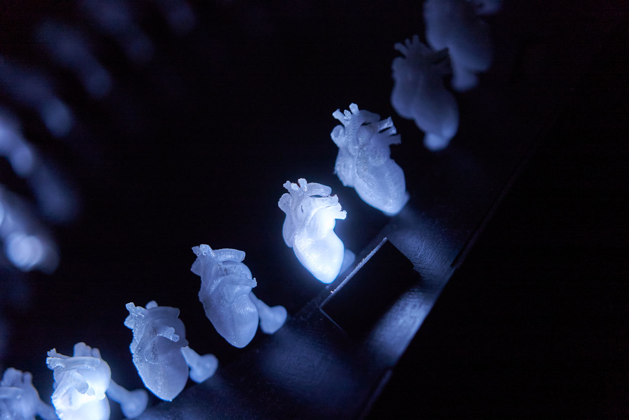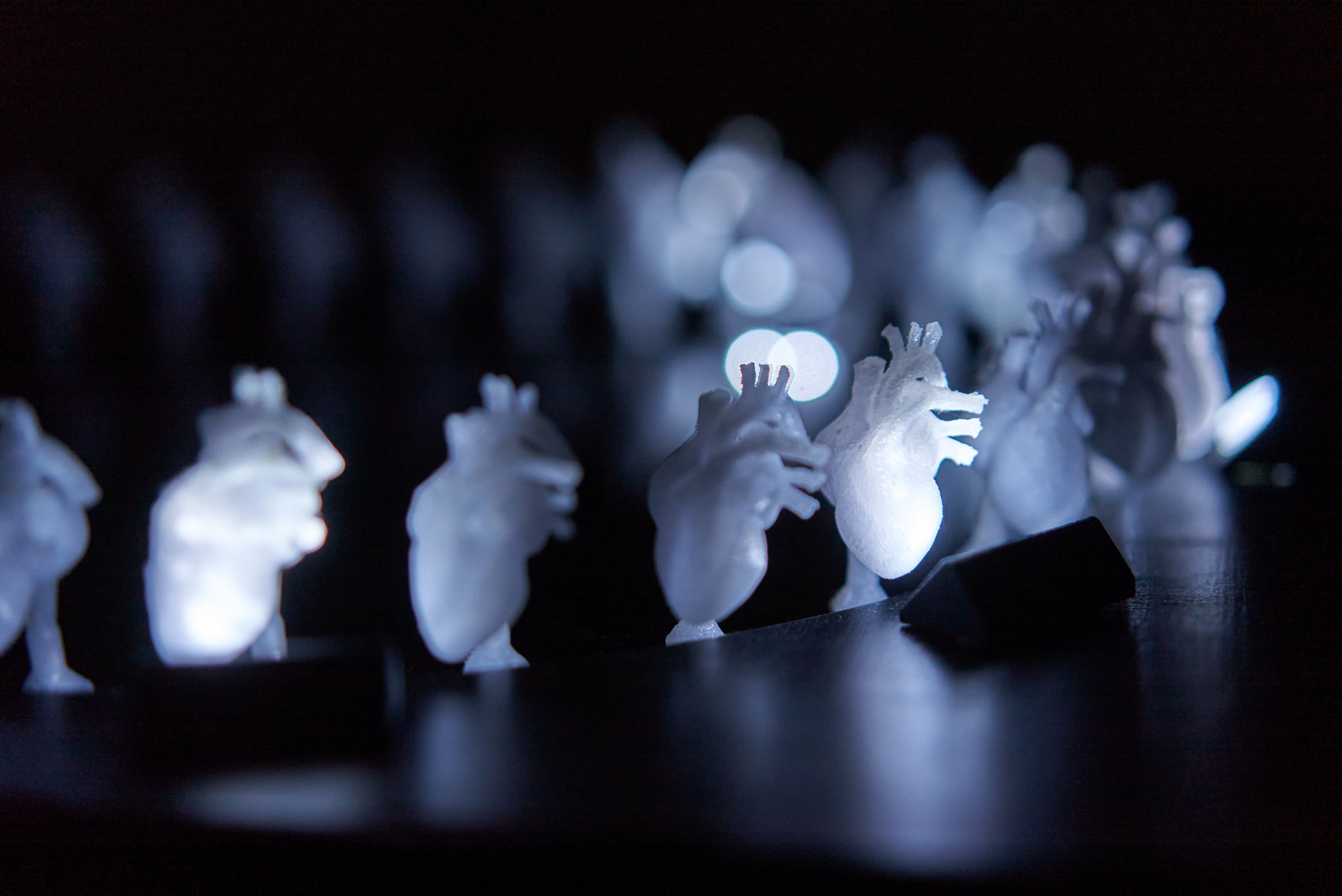A 3D printer printed the beating hearts frame by frame with PETG, and the stepper motor rotated them.