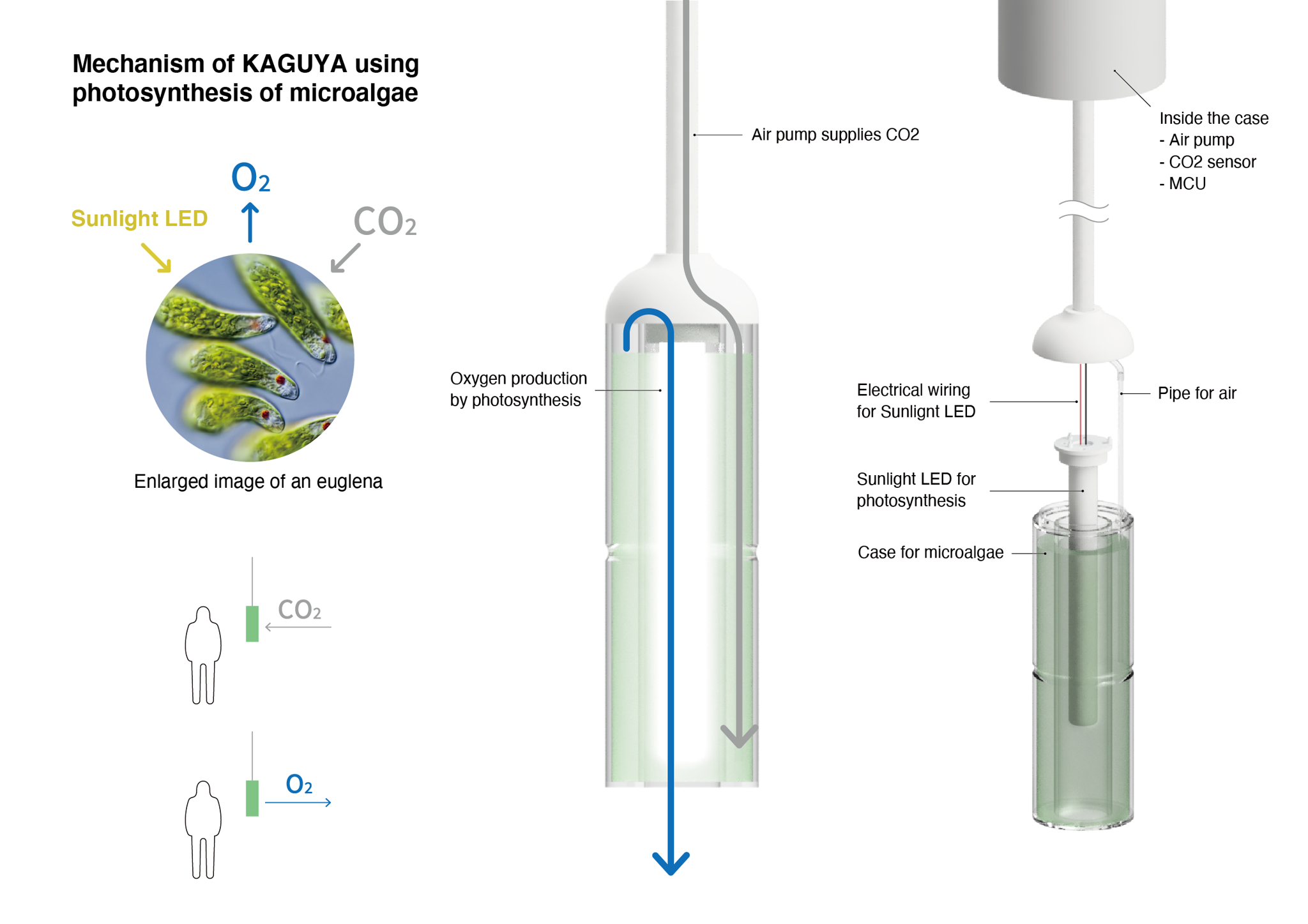 照明のケース内には水と微細藻が入っており、そこにエアーポンプで送り込まれるエアーとLEDライトによって光合成が生じて酸素を生成します。この製品には二酸化炭素センサーが内蔵されており、部屋の二酸化炭素を常に計測しています。そして、部屋に多くの二酸化炭素があると、自動でライトの光量とエアー量を上げて、微細藻に光合成を促します。逆に、二酸化炭素が少ないと、ライトの光量とエアー量が下がり、微細藻の光合成を抑制します。また、微細藻の培養が進むにつれて、水の色が薄い緑から濃い緑へと変化していき、二酸化炭素から生成された酸素量を数値ではなく色で感じる事が可能です。竹がぼんやりと光っているように見えることからKAGUYAという名称にしました。