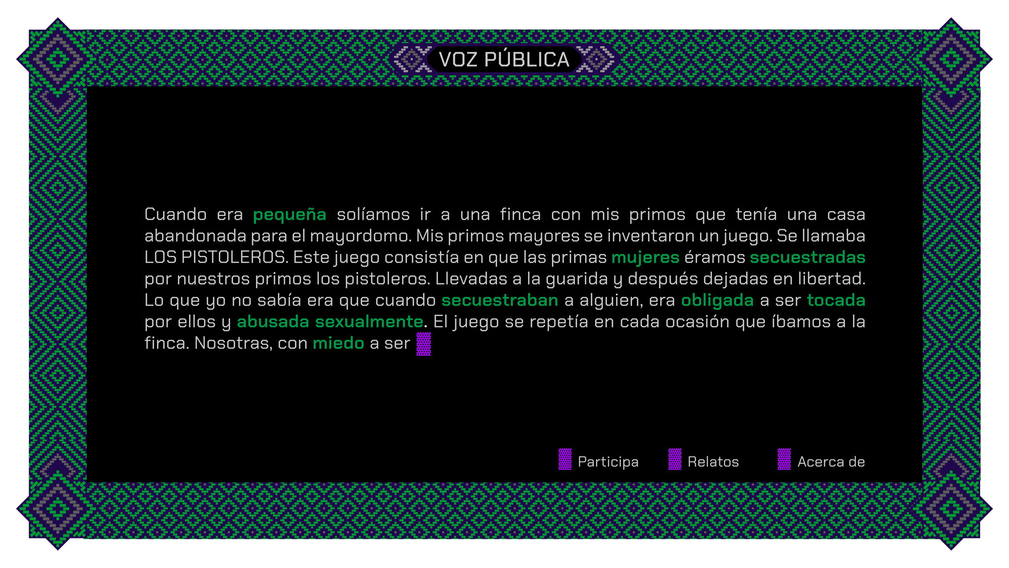 The first part consists of an online participation and visualization platform (www.vozpublica.cc) )where women and non-binary people can share, in a textual and anonymous way, personal stories related to this problem. From these contributions a database is generated that compiles these stories. This database is linked to the other two parts of the projects.