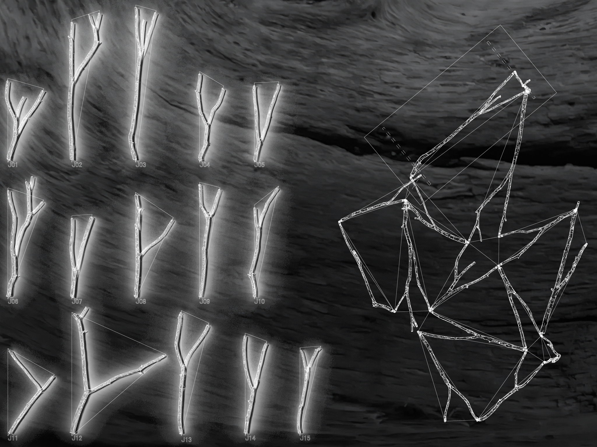 森林や公園では環境保全のため、林地残材が大量に発生しています。しかし、その大部分が放置・破棄され、モノづくりの材料として利用されることはほとんどありません。私たちはそうした不定形の枝材も利活用可能な木材市場として再定義したいと考えました。「いま手元にある枝=木材のアベイラビリティ」を出発点とすることで、設計に基づいて材料を調達する従来のモノづくりとは真逆のアプローチを提案します。