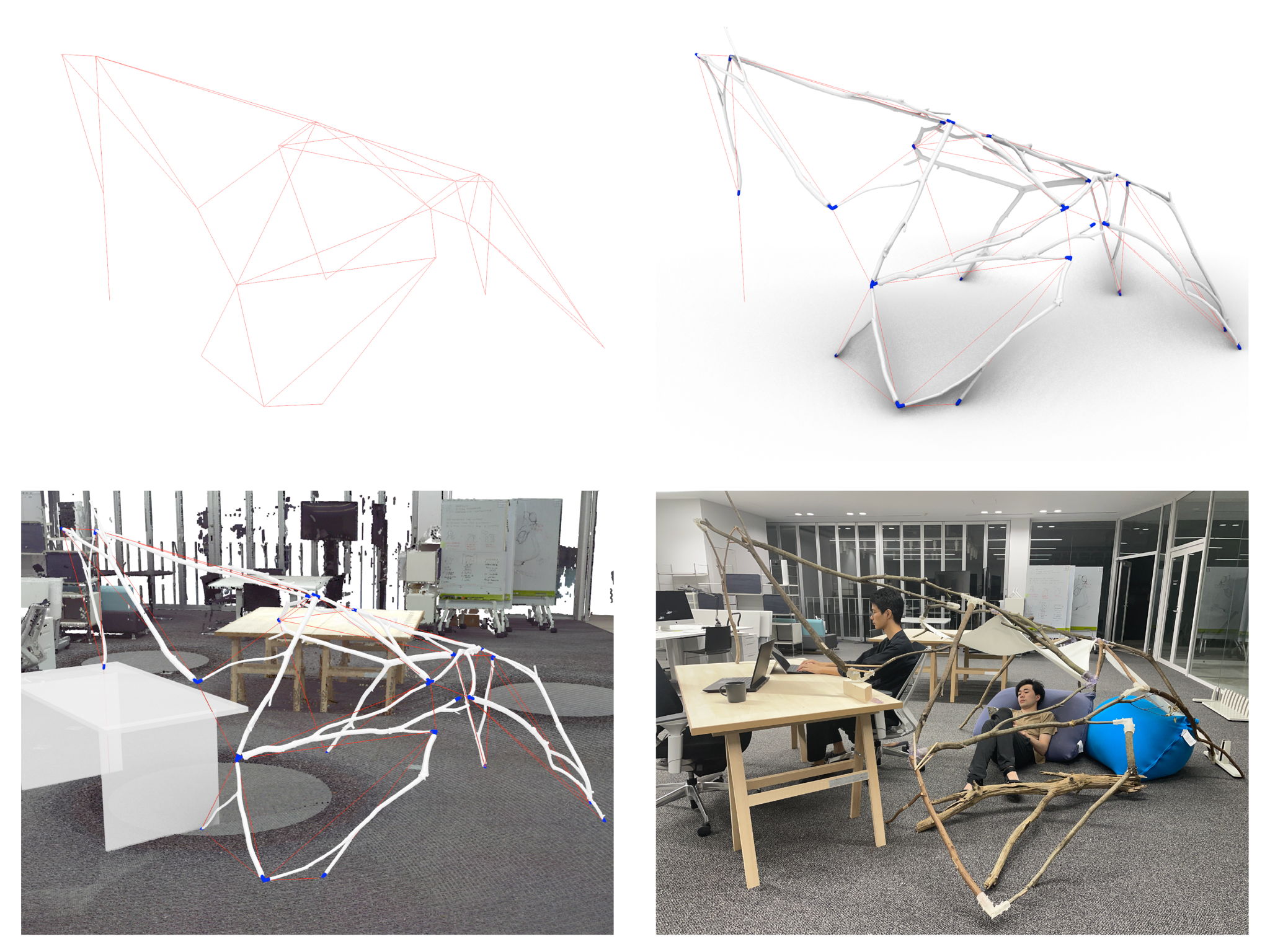 ③ 組み立て:設計に従って、枝同士をジョイントパーツでつなぎ合わせましょう。パーツは十分な剛性を持ち、枝一本一本の形に厳密にフィットするように3Dプリンタで出力されます。