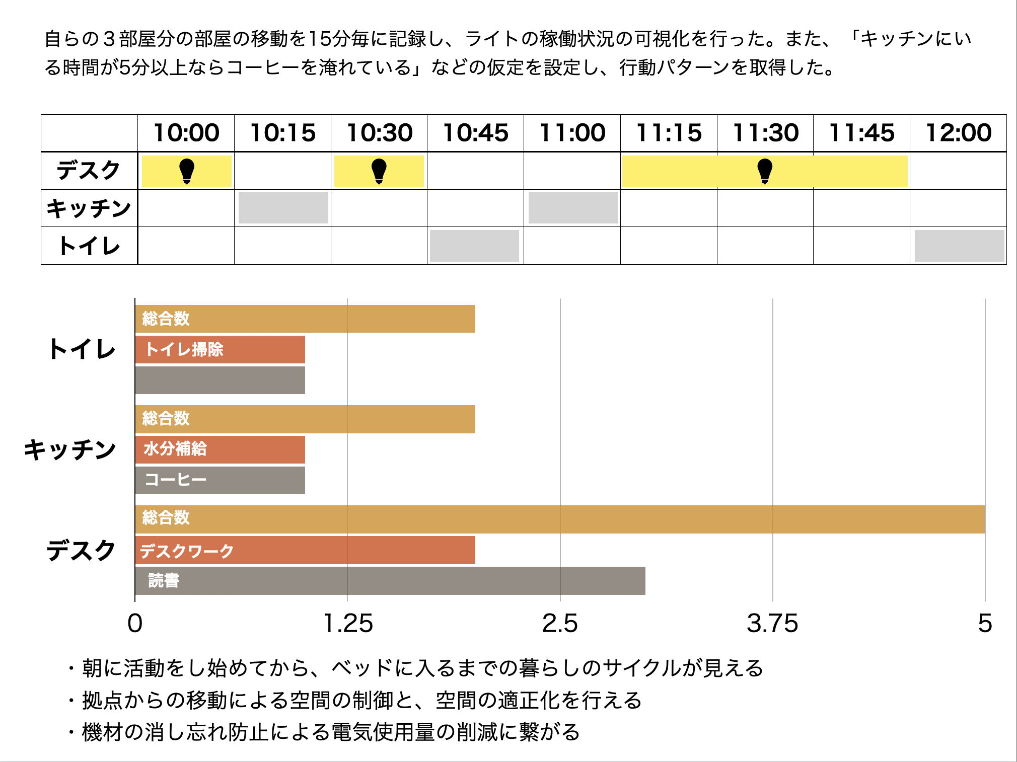 例えば本を読み始めて1時間後にコーヒーを淹れているという行動パターンが分かれば、コーヒーマシンと連動してデスクで本を読み始めてから1時間後に自動でコーヒーが出来るようにする事が可能だ。