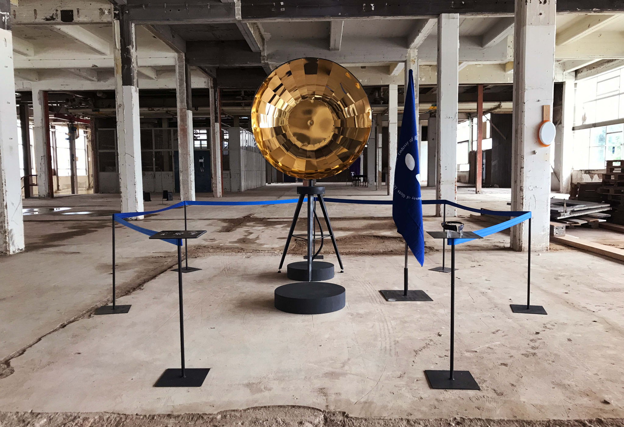 The Embassy of Aliens is a 3-minute musical communication experience that is composed of one satellite, one brainwave headset, one embassy flag, one standing podium, and a fence. The total size is 400 x 400 x 220 cm. The brainwave headset reads the signal from the experiencer’s brain and transmits the signal to the computer in a way of numbers through Bluetooth. Max/MSP, which is the software in the computer, translates the signal from numbers to the pitch and the length of the sounds. The sounds will be played through the satellite. The satellite is made of steel and aluminum. With the audio activators attached to the surface of the satellite, the installation becomes a speaker and plays the sounds back to the experiencer through the satellite installation in real-time. The human imagination influences the brainwave signal, the brainwave signal influences the sounds, and the sounds influence the human imagination. This feedback loop makes the inner communication happen.