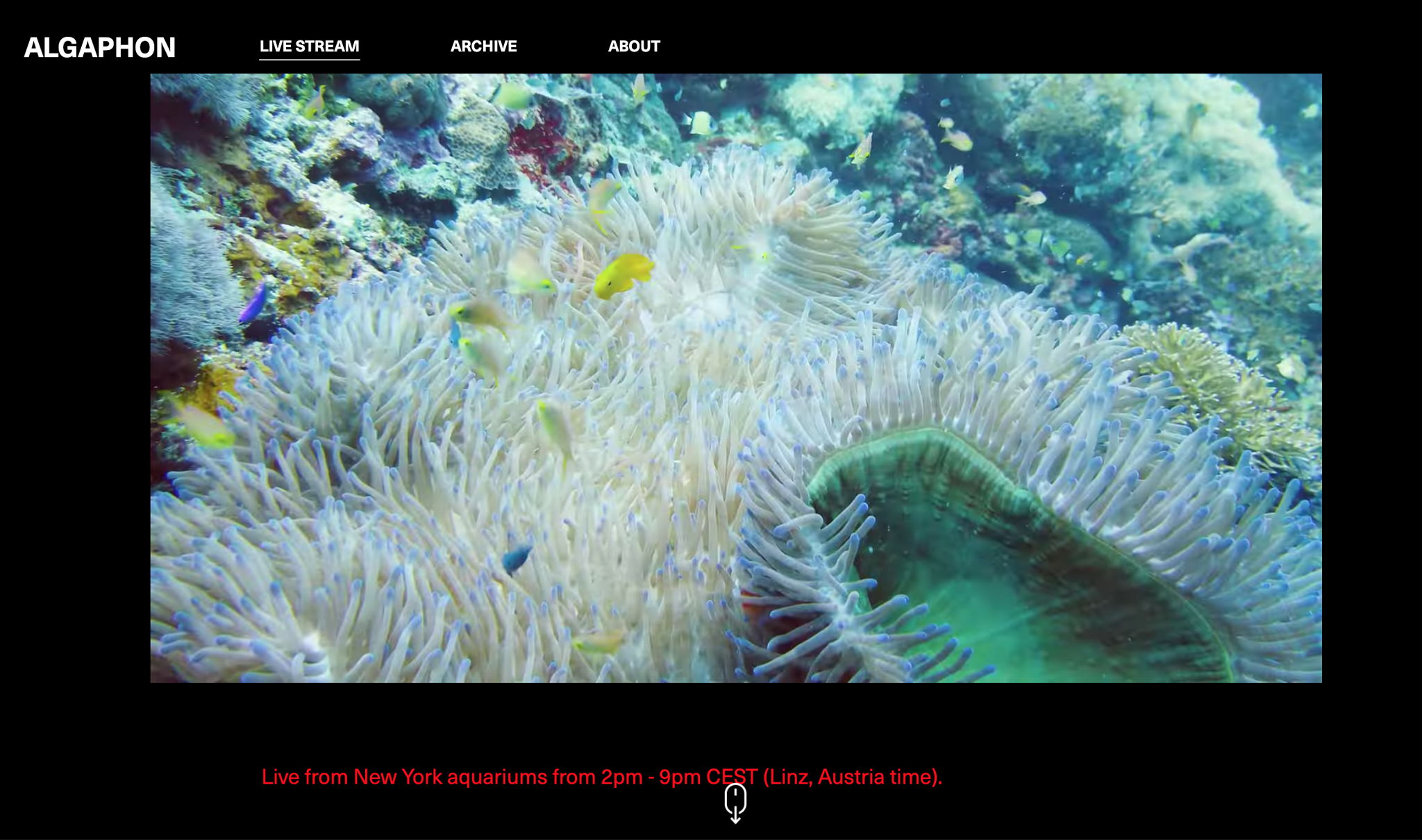 Screenshot of online live stream played around the world, as the visitor audio recordings were processed through aquariums and algae photosynthesis bubble response played.