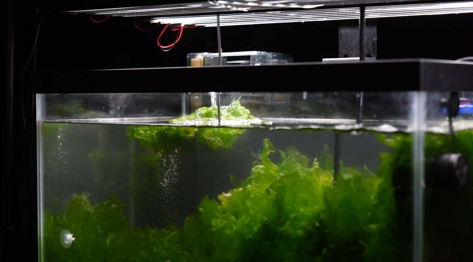 Algaphon is a hybrid installation wherein algae bubbles that ring at minnaert frequency near algal filaments are rendered audible through a hydrophone. Our setup (Fig 2.) comprises of an aquarium (10-20 gallon capacity), programmable LED lighting (5500k, 80-100W) mounted at a distance of 10-12” from the water surface and macroalgae species in the water. Normal maintenance routine is carried out for the algae such as keeping steady water flow using wavemaker, maintaining 73-76F temperature and dosing micronutrients such as NO3/PO4/Fe/Mg. Standard 12h on/off lighting routine was followed during the duration of this exhibition. When the light is turned on, algae photosynthesis produces oxygen that gets dissolved in water. After 2-3 hours of light being turned on, dissolved oxygen levels reach a threshold following which algae starts producing bubbles as a result of local supersaturation of oxygen in water.