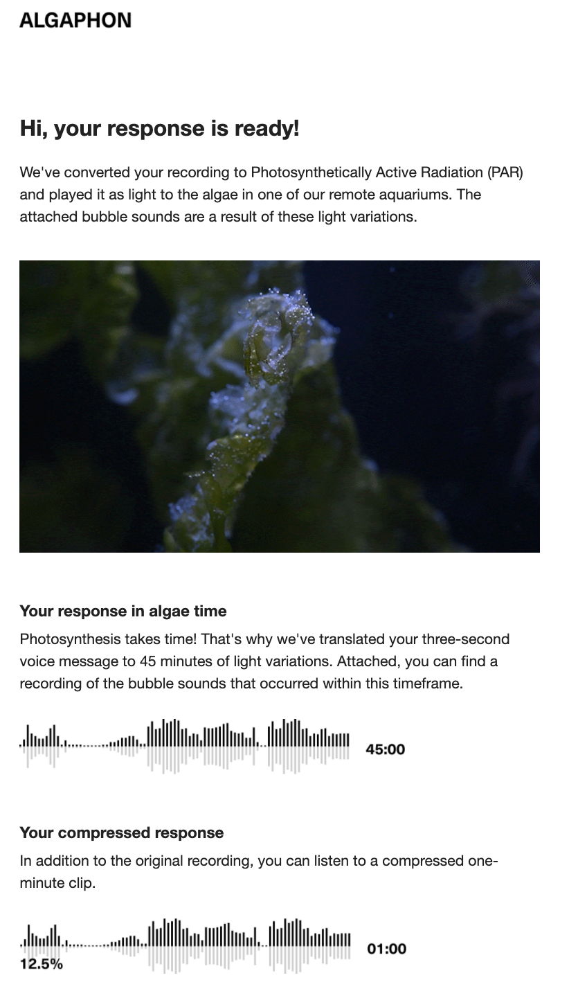 Bubble variations occur as a result of PAR variations over an aquarium. The algae audio bubbling response, recorded via hydrophones, was live streamed on our website during the full duration of the exhibition. Each algae response, occurring as a result of user input, was saved locally (~45min audio/visitor input) and also sped up to a min long audio. Because of the queued nature of responses and long response duration, the visitors do not hear an immediate response. The audio response is sent in two modes, in algae time (~45min) as well as in compressed time (~1min), over email.