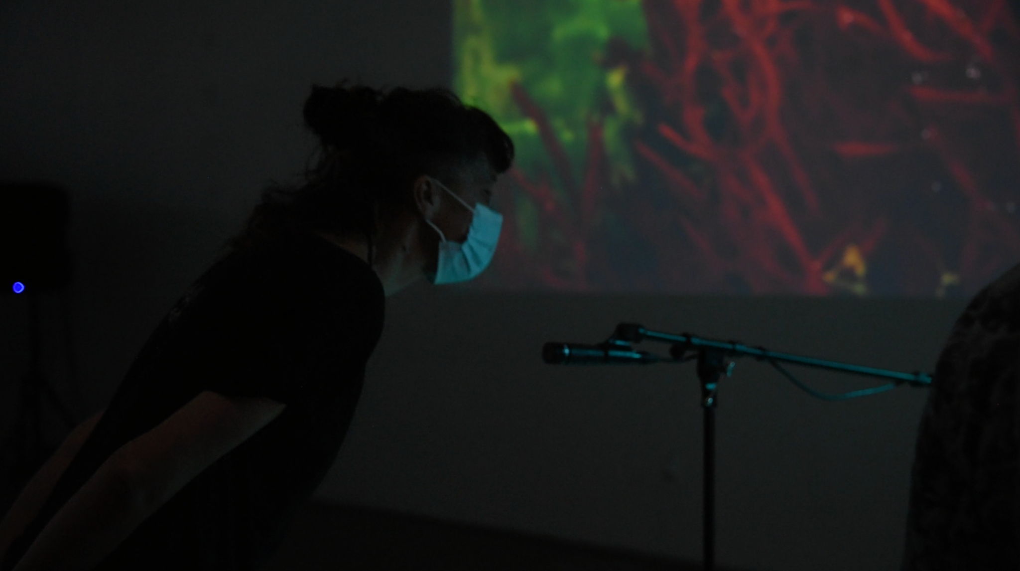 A visitor shown here recording their sounds during an offline showcase. These voice recordings are queued to an active aquarium and played over the aquariums after conversion to light radiation.