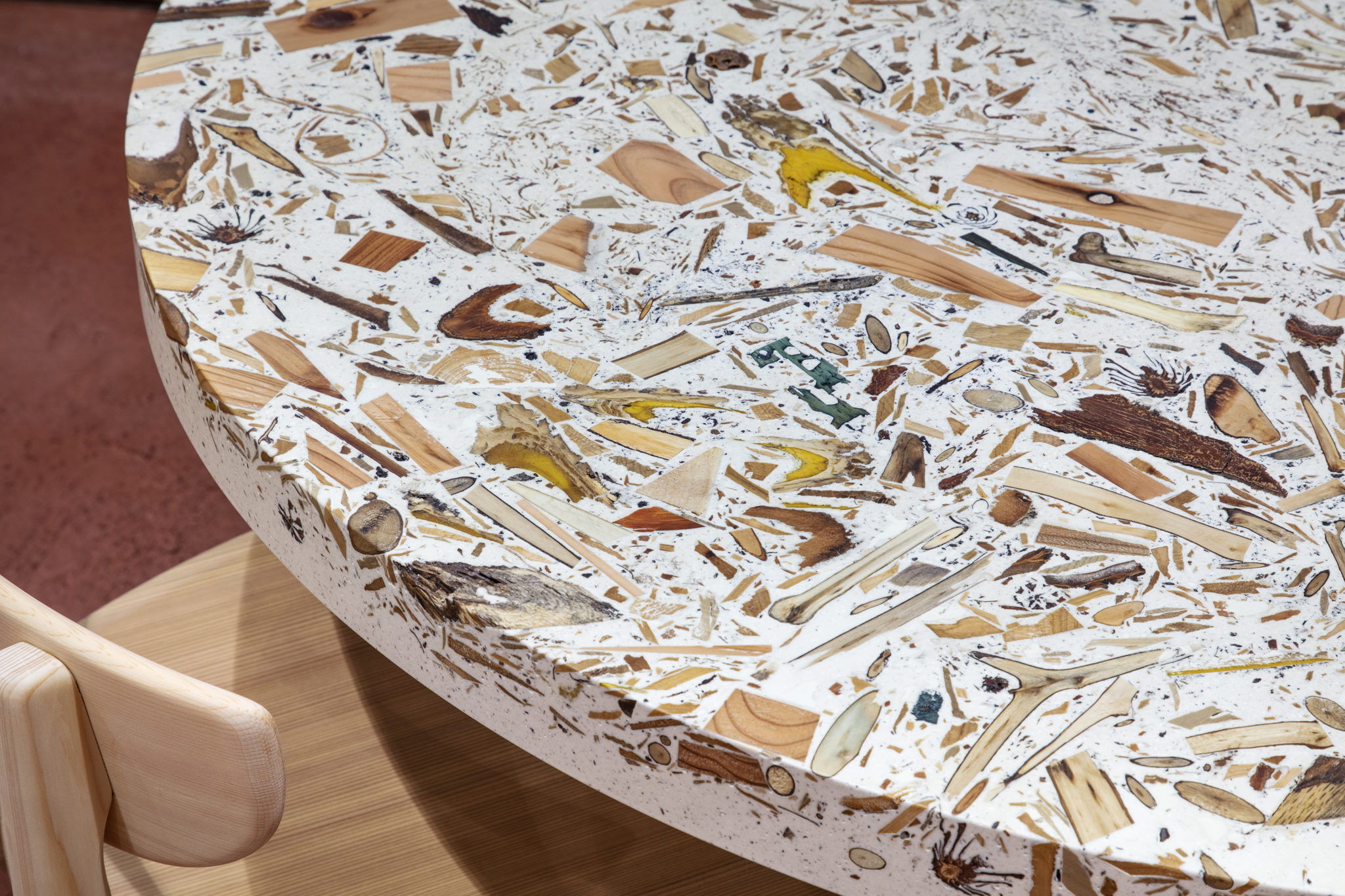 ForestBank™️は、森林をめぐる課題や可能性についてリサーチを行い、製材された木材だけでなく森林そのものが持つ多様な価値に着目し、それを表現するべく様々な実験を通して新たなマテリアルとして開発された。本来なら建築や家具用の木材資源として価値のない小径木や枝葉、樹皮、実、その森の土など樹木にまつわる様々な物を、反応性ミネラルベースと有機溶剤・VOCを一切使用しない完全水性アクリル樹脂と混ぜ合わせ製作している。