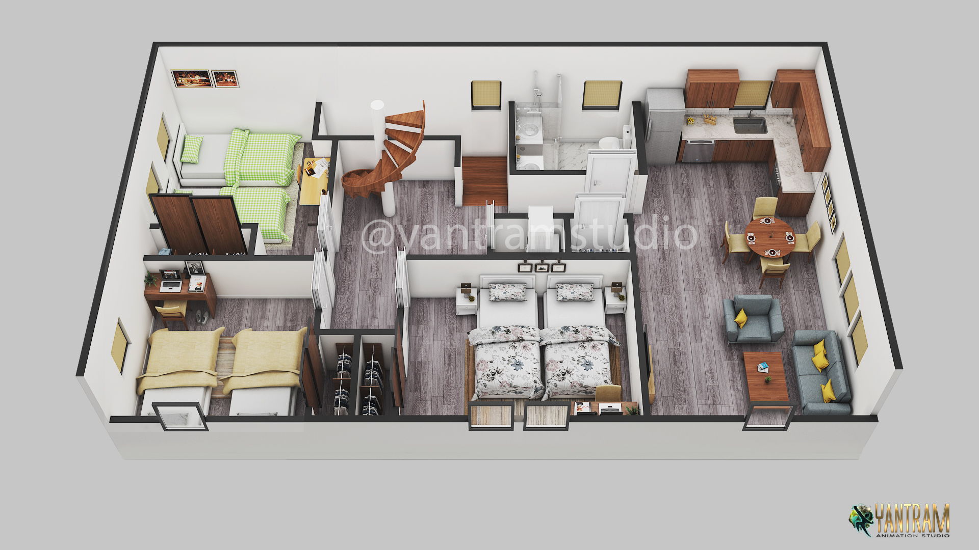 3D Floor Plan Design Service of 3 Bedroom Home by Yantram Floor Plan Designer, Los Angles, USA