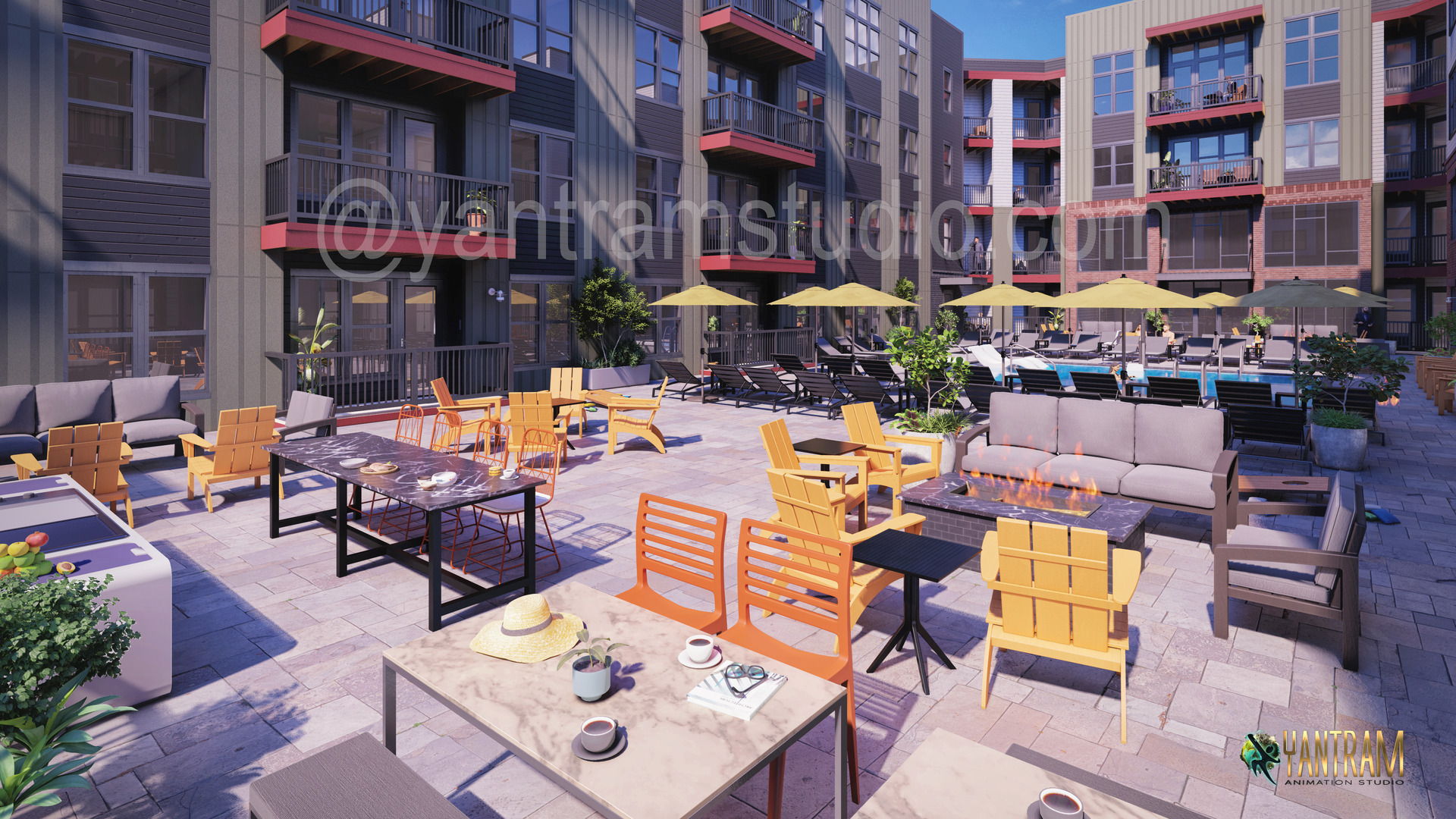 Here you can see 3d Exterior Rendering Studio created a pool Lounge in New York, USA.there pooled with a sun lounge and also a setting area with a fireplace. cafeteria