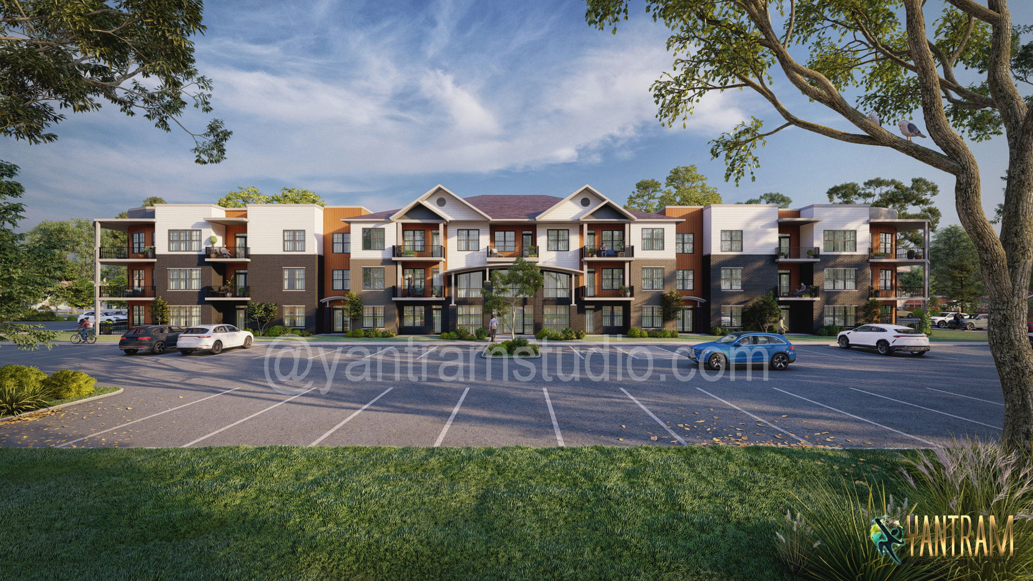 3d architectural visualization has visualized a residential apartment in Chicago, Illinois. The studio used a variety of software, including 3ds Max, V-Ray, and Photoshop. The finished product is a realistic and accurate representation of the proposed Residential Apartments. The 3D visualisation help's you to convince the local authorities to approve the project. Yantram 3d architectural design services created Residential Apartments in Chicago, Illinois. Here you can see the exterior of an amazing residential apartment and a beautiful garden where you can enjoy your morning exercise or do some yoga. There is a huge parking area and also a thoroughfare where you can walk or you can use a bicycle.
