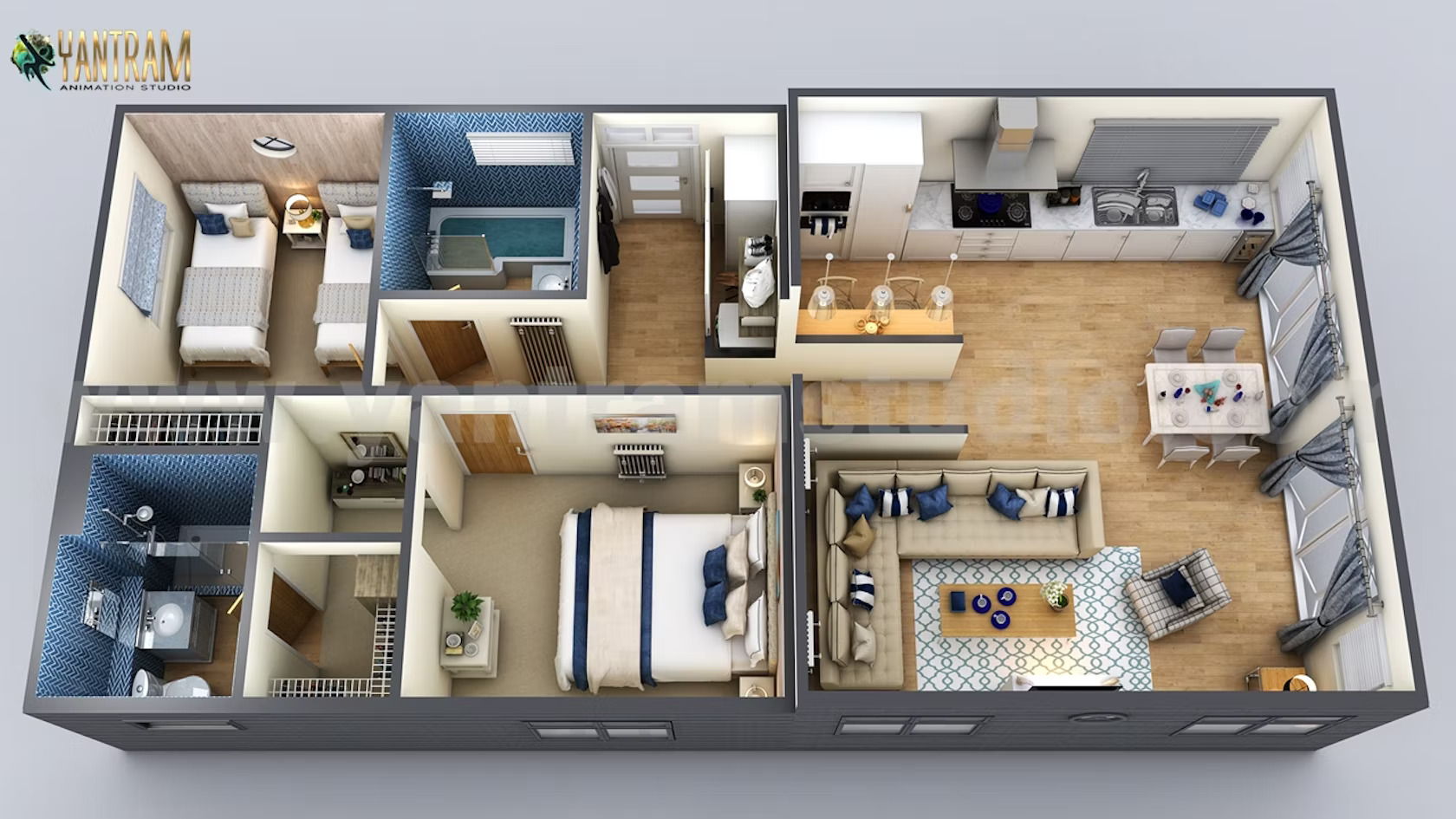 3D floor plan rendering is a 3-Dimensional illustration of a 2D floor plan, It replaces the traditional black-and-white 2D floor plan, making it easier for home buyers to learn, comprehend, and imagine the spaces in 3D before the house is completed. Yantram 3D Architectural Rendering Studio Meridian, Idaho Provides a 3D Floor Plan Design Along with the location of walls, windows, doors, and stairs, as well as fixed installations such as bathroom fixtures, kitchen cabinetry, and appliances.