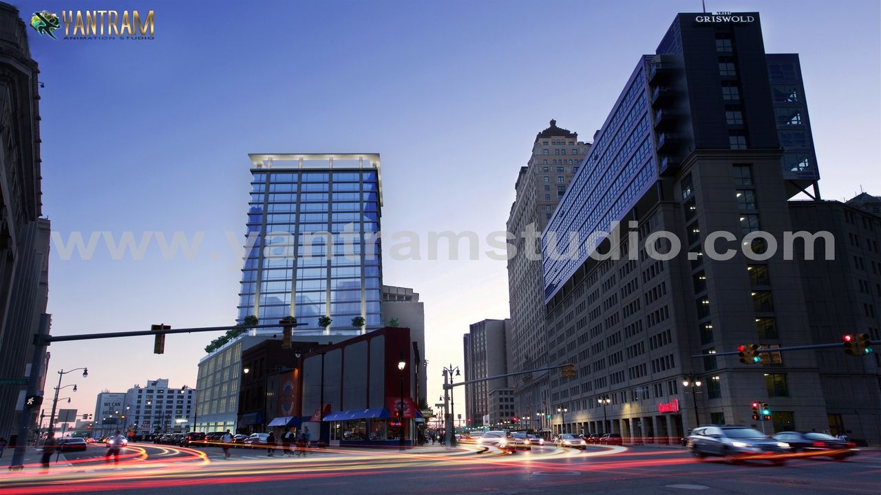 The 3D Architectural Services have provided a 3D Exterior design of the building in evening view. The clear reflective glass on the entire building looks stunning and is positioned as a diversion between two roads. The quality and effect added to the traffic on the road create photorealistic 3D Visualization. 3D Modelling Services are great to help and are taking over the 3D Architectural World with its wonders. 3D Architectural Modelling Services helps to describe the client's image and picture it into high-quality renders.