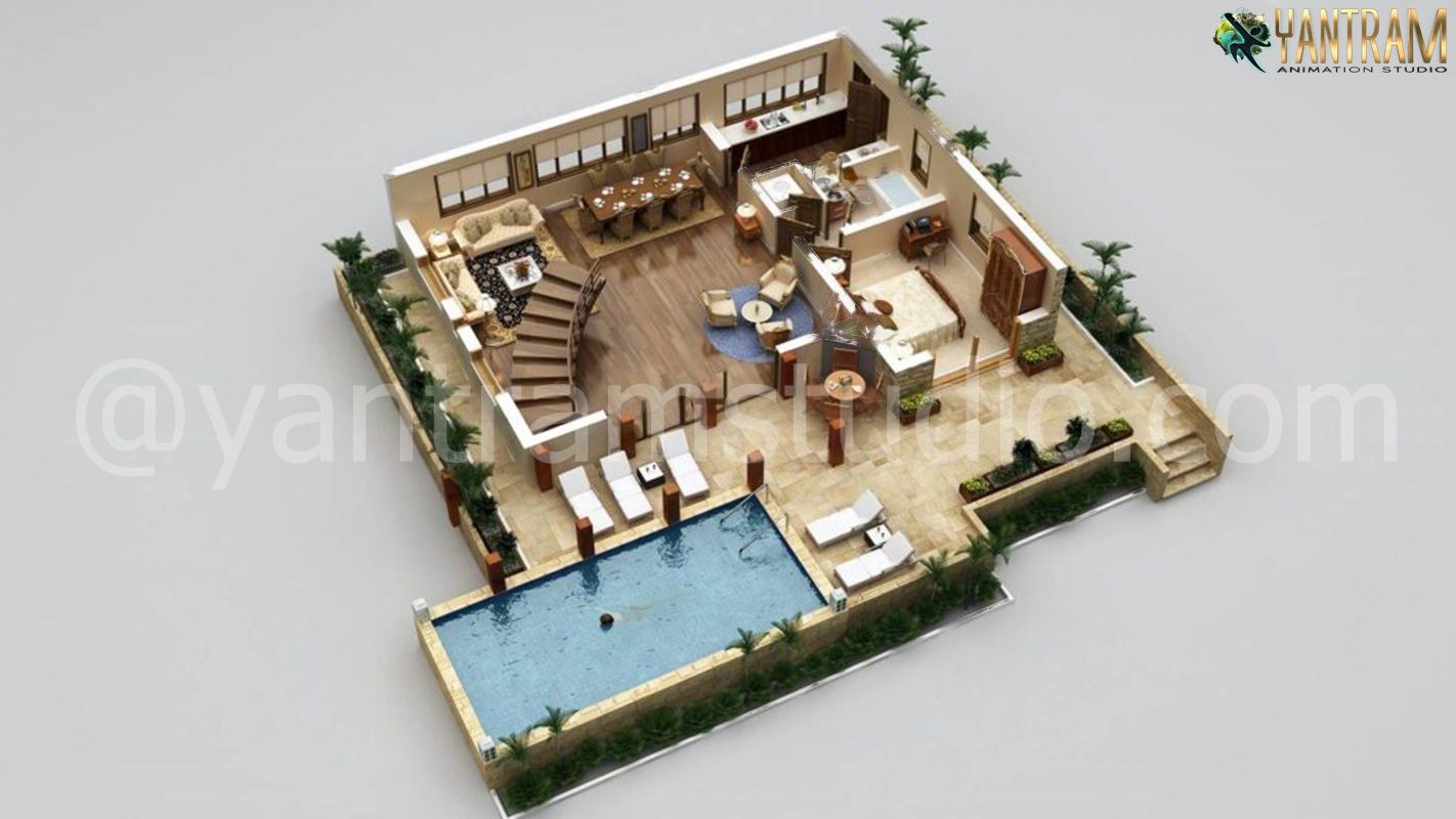 The 3D Floor Plan provided by 3D Visualization Studio shows the Traditional design of the interior in Chicago; the bedroom has all the furniture ready; the texture and color which is suitable are explained in the 3D Floor Plan design. The verandah shown in 3D Visualization is massive and the swimming pool is designed along with some sitting arrangements for sun baths. The Interior of the living room is very minimalistic and Traditionally styled in the 3D Floor Plan, the kitchen is closed by a wall, with a door opening towards the dining table, and the staircase is presented next to the entrance. 3D Floor Plan Services have created this innovative plan in Chicago, by Yantram 3D Architectural Visualization Studio.