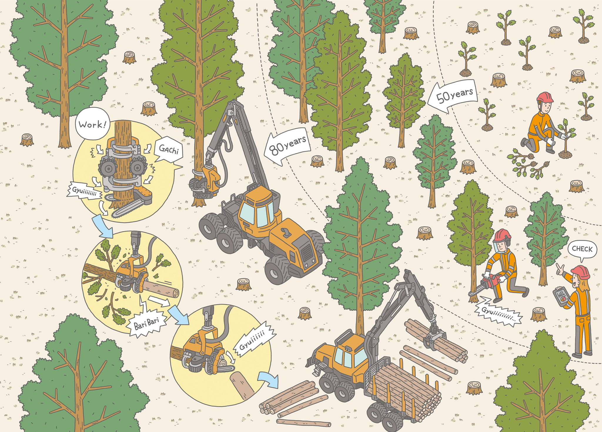 鳥瞰図の視点で林業の重機や労働者のイラストを線画でシンプルでコミカルに。