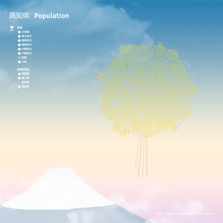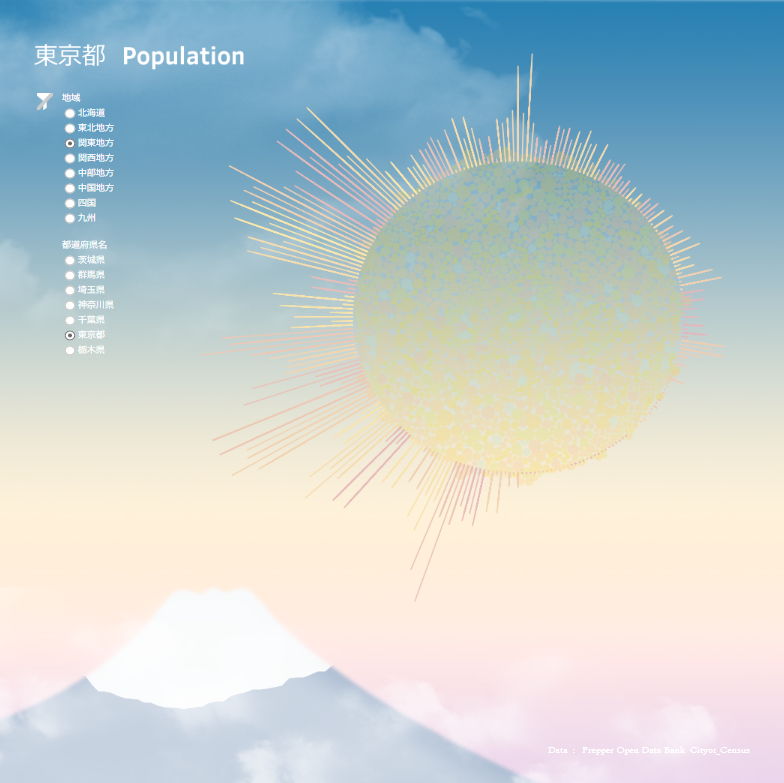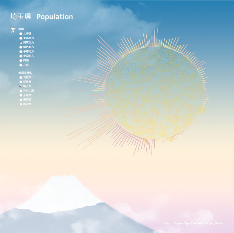 太陽の中、富士山も人口データで、富士山の雪の量は選択した都道府県で変化します。