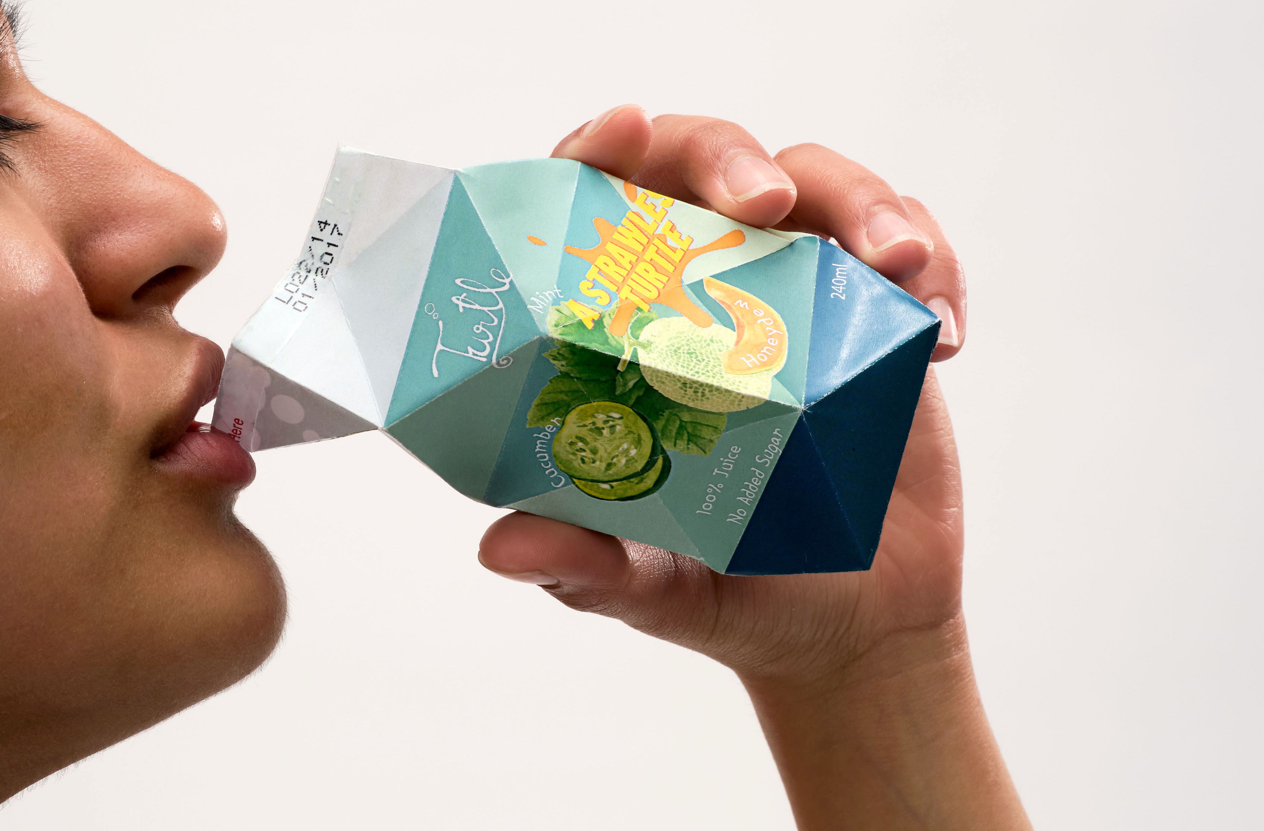 The Strawless Turtle Pak is a beverage packaging designed to be consumed on the go. Its foil-backed cardboard packaging is shaped like a turtle to symbolize the fight against the effect of plastic pollution on marine life.