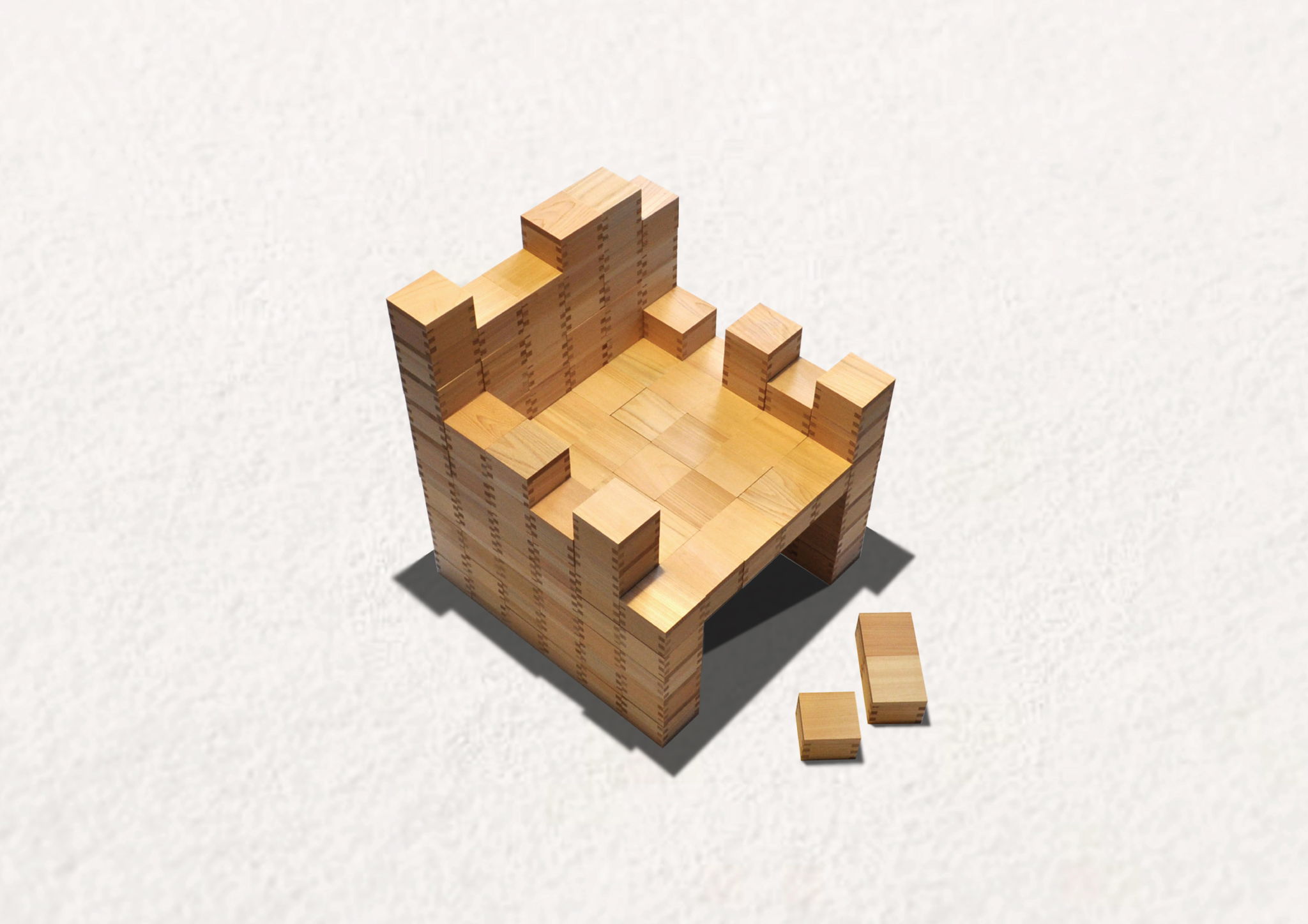 ここは、福井県勝山市のとある工房である。施主は、長年この工房で仲間たちと生地の製作を行っていたが、活動を広く知ってもらうべく、製作現場を地域に開きたいと考えていた。そこで、工房の一角にキッチン兼大きなカウンターをつくり、カフェやワークショップが行われる工房へと生まれ変わらせる計画がはじまった。地域の人や仲間とコミュニケーションを取りあえるような大きなキッチンカウンター。さらに、このキッチンカウンターはみんなでDIY でつくれるよう計画する。すると、つくりながらお互いのコミュニケーションを取り合えるからだ。そこで、つくりやすさを考慮して、カウンターと積み木を組み合わせたカウンターをデザインした。DIY でつくるには、複雑な製作だと「やる気」が損なわれてしまうので、作業の「単純さ」がとても大切である。シンプルな工程、作業とできあがったモノの美しさを兼ね備えた