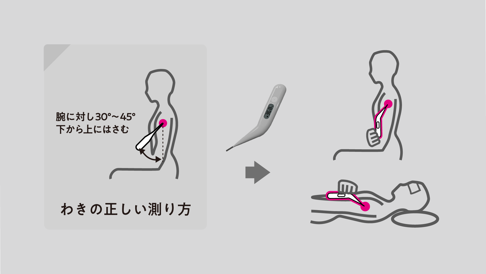 体温を脇下で測る場合、体温計を腕に対し30~45度の角度で下から上に挟み込む方法が正しい測り方とされる。これはセンサーを正しく脇の中心に当てるためである。従来の体温計は、計測中胴体に対してその角度だけ体温計が飛び出て、衣服と干渉してしまう問題があった。下着になるにも着替えの手間がかかるほか、衣服を着たまま測りたい場合は、体温計がずれないようにより強く脇を閉めたり、手で押さえ続けたりする必要がある。