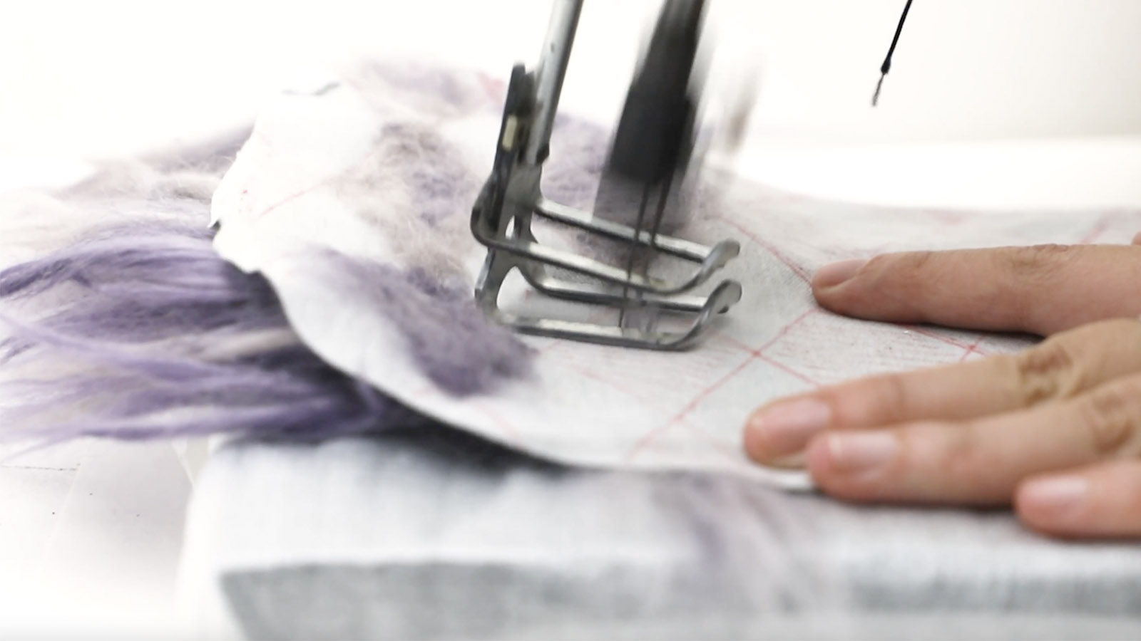 The craftsmanship aspect involved the utilization of innovative machines, namely the "Implanting" machine and the "Flocking" machine. The Implanting machine represents a groundbreaking technology capable of integrating any type of fiber into any fabric, employing a mechanical structure inspired by the process of hair transplant surgery. The needle mechanism, simulating crochet patterns, enables the precise placement of fibers at the back of the fabric. Notably, this portable machine permits the implementation of various patterns and designs, facilitating versatility in fiber implantation.