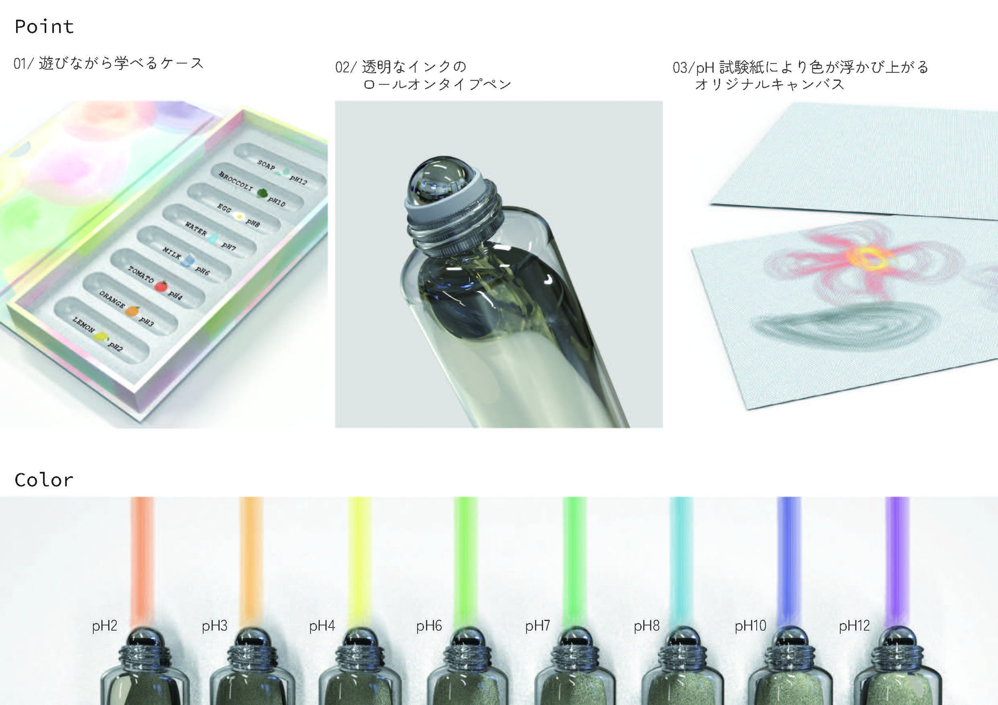 「pHレベルカラーペン」は、子供たちの創造性を刺激するための、化学反応を使った新しい画材です。見た目は透明なインクが、キャンバスに触れる瞬間から魔法のように色彩を生み出し、楽しみながらアートの世界を探求できます。