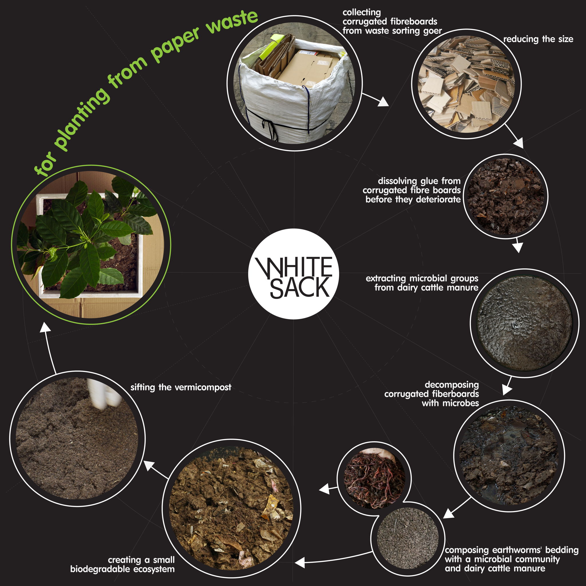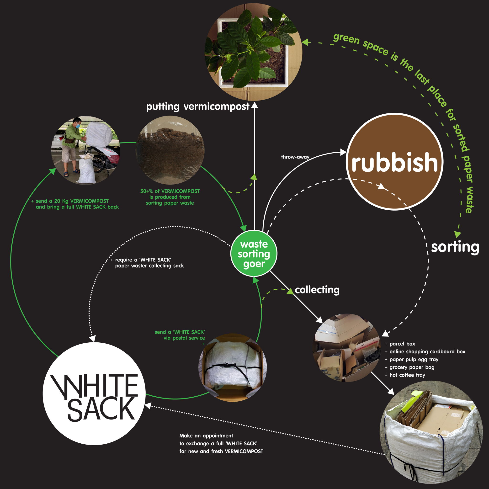 White Sack is an organic recycling system that turns paper waste into vermicompost that may be used for planting and greenery maintenance. The service cycle bridges the gap between consumption and waste management. Customer are given rich nutrients compost for growing plants and turn their greenery to be paper waste management area, thereby improving the environment, offsetting carbon and increasing green space in same time. White Sack employs a biodegradation technique to produce an ecosystem suitable for decomposing paper waste, particularly corrugated fiberboards and cardboard, and converting it into vermicompost with new hatchlings earthworms which will be grown up to be natural earthworm later and improve ecosystem in soil and ground.