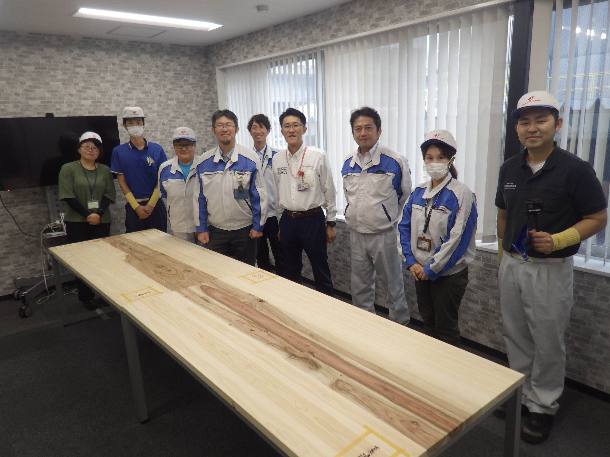 With the assistance of local lumber professionals, the felled wood was processed and assembled into tables. The tabletops were combined with "Aichi Certification Wood," Japanese cypress sourced from Aichi Prefecture's forests, embodying values of forest conservation and CO2 sequestration. These tables are now in use in the factory's offices and lobby.