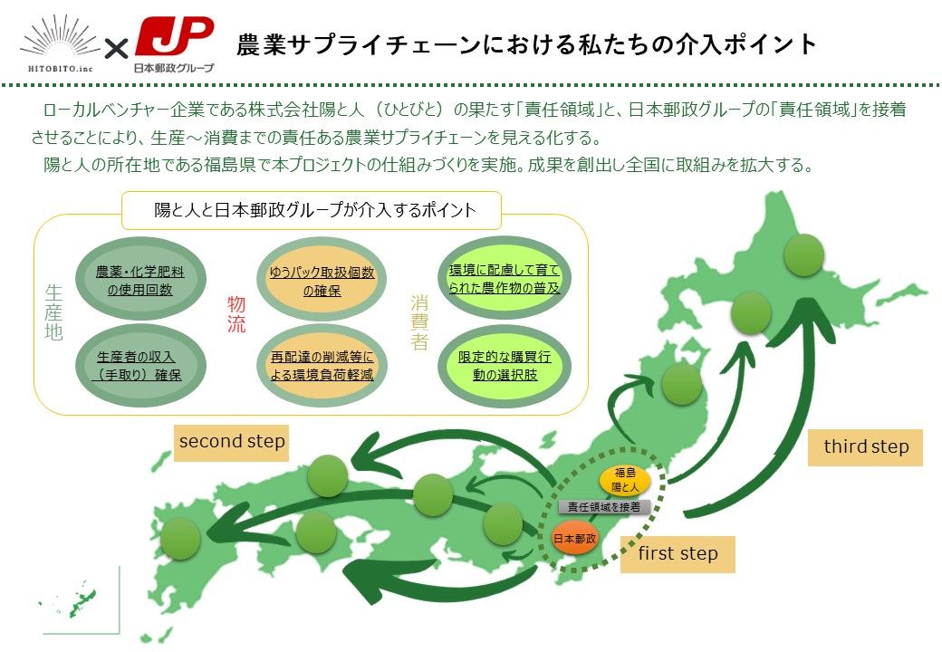 Farm to tableは、ローカル共創イニシアティブ※により日本郵政グループから株式会社陽と人(ひとびと)に出向している社員が企画している共創プロジェクトです。