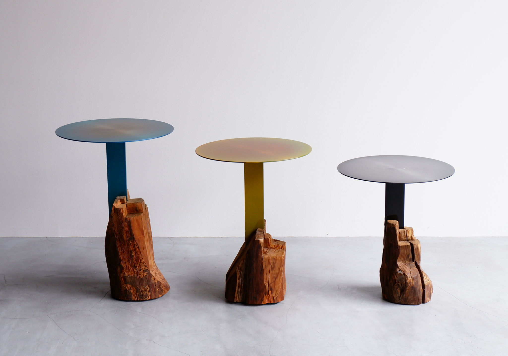 時代の変化に伴い存在意義を失った廃材そのものや、その背景にあるストーリーに共感し、新たな解釈を加えて廃材の魅力を伝える、空間・プロダクト・スキームのデザインを提案・発信しています。第1弾となるサイドテーブルは、木造家屋を長年支え続けた梁材の端部をベースとし、その上に年輪を連想させるような特殊な粉体塗装技術を持つシリウスのグラデーション塗装を施した天板を組み合わせることにより、家具やオブジェクトとしての新たな意匠性や価値を見出しています。廃材の価値を再認識できるだけでなく、メーカーとの協業によって最先端技術についても同時に発信する媒体としての役割を担うプロダクトとなっています。