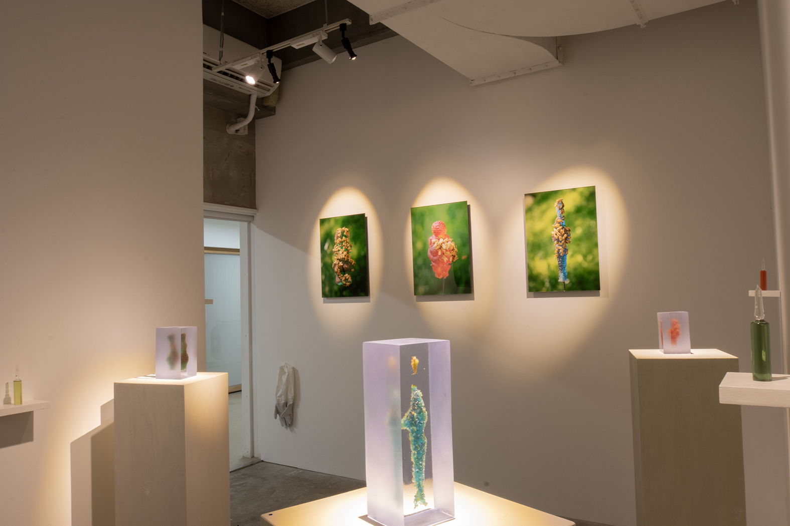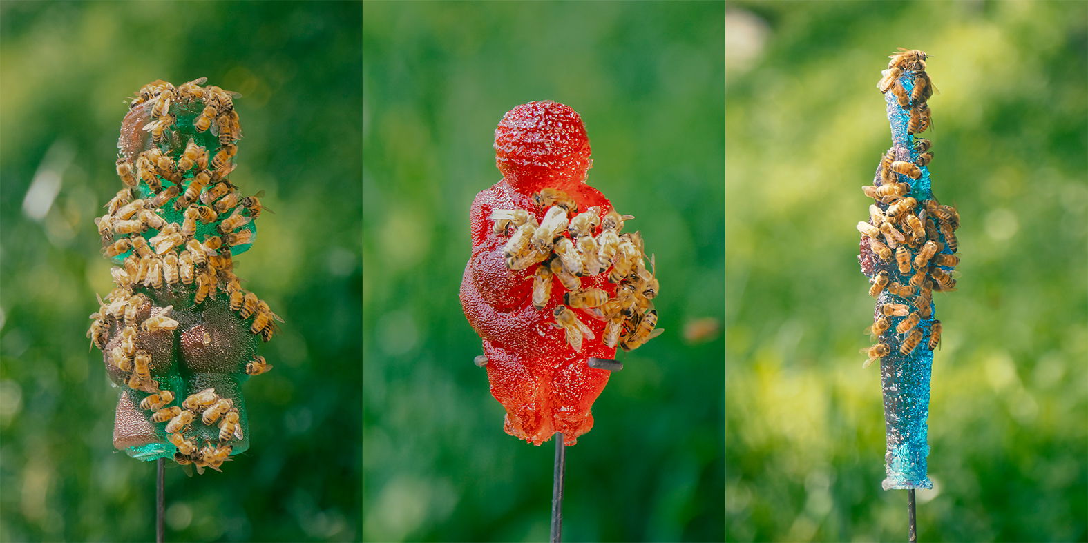 This work uses as its motif a statue said to have been made in ancient times to pray for a good harvest. The three statues are "Venus of Willendorf," "Venus of Jomon," and "Artemis of Ephesus. The candy is colored and given to the bees. The bees visit the statues every day and gradually bring them back to the hive, where they are transformed into colored honey. At the same time, the mother goddess is disfigured and disappears. The process and results of this process are photographed and filmed, and exhibited together with the honey collected.