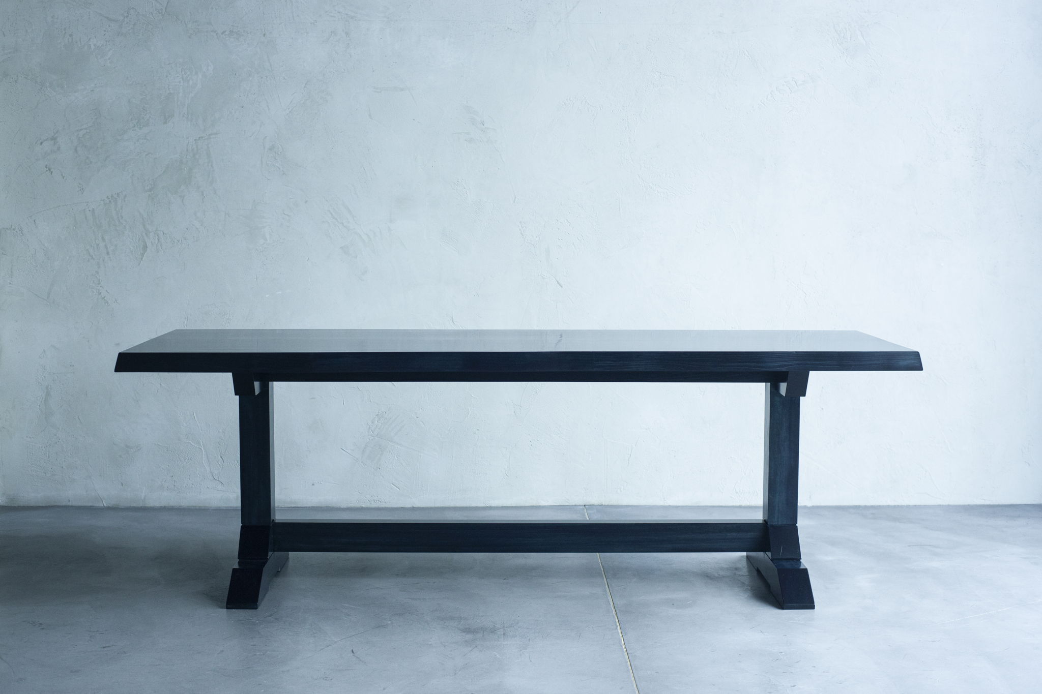 古来から布を染める為に使われてきた技法の「藍染」を木製の家具に転用し独自の染色技術を施しています。樹種や部位によって色の異なる木材を藍色で統一することで端材のつなぎ合わせであっても一枚板のような重厚な一体感をつくだしています。